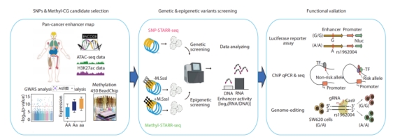 研究团队整合了SNP-STARR-seq与Methyl-STARR-seq两大高通量筛选平台,在三种结直肠癌细胞模型(原发性HCT116、SW480及转移性SW620)中,系统评估了30,790个非编码SNP与超过134,000个CpG位点对增强子活性的影响。通过这一规模化筛选,绘制了CRC迄今最全面的等位基因与甲基化依赖性增强子活性图谱,建立了从变异识别到机制验证的完整研究范式。