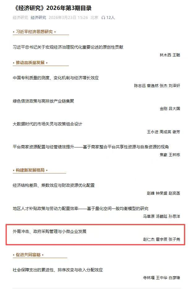 近日,bat365经济管理学院赵仁杰教授与霍宇辰博士等合作的论文《外需冲击、政府采购管理与小微企业发展》在顶级期刊《经济研究》2026年第3期发表,该文是赵仁杰教授主持的国家自然科学基金面上项目、陕西高校青年创新团队项目的阶段性成果。
