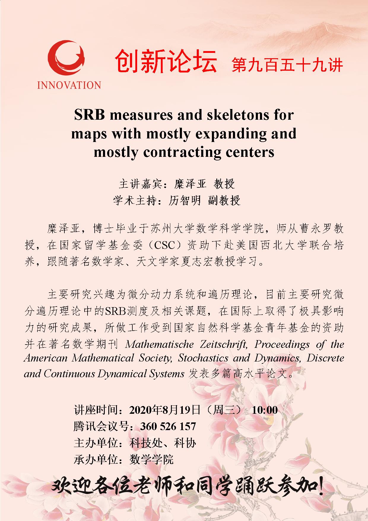 糜泽亚 教授 bat365正版唯一官网创新论坛第九百五十九讲:SRB measures and skeletons for maps with mostly expanding and mostly contracting centers 讲座时间 2020年8月19日(周三)10:00 讲座地点 腾讯会议ID:360526157 讲座人介绍 糜泽亚 教授 讲座内容