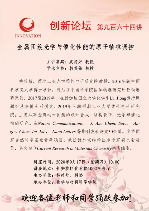 姚传好 教授 bat365正版唯一官网创新论坛第九百六十四讲:金属团簇光学与催化性能的原子精准调控 讲座时间 2020年9月17日(星期四)10:00 讲座地点 长安校区化材楼1002报告厅 讲座人介绍 姚传好 教授 讲座内容