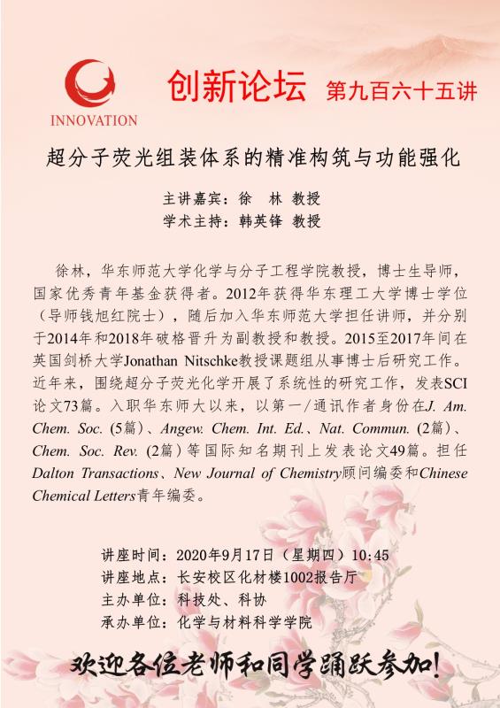 徐林 教授 bat365正版唯一官网创新论坛第九百六十五讲:超分子荧光组装体系的精准构筑与功能强化 讲座时间 2020年9月17日(星期四)10:45 讲座地点 长安校区化材楼1002报告厅 讲座人介绍 徐林 教授 讲座内容