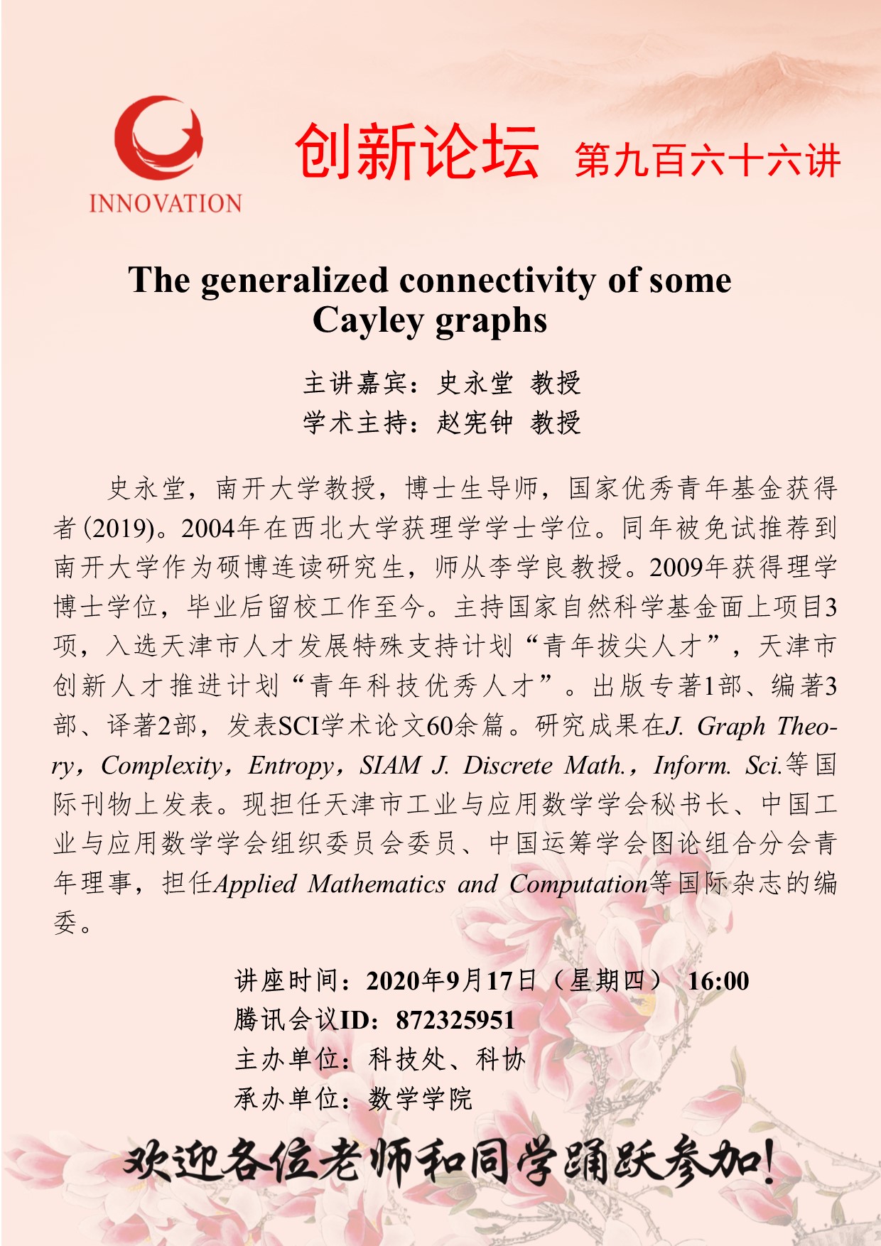 史永堂 教授 bat365正版唯一官网创新论坛第九百六十六讲:The generalized connectivity of some Cayley graphs 讲座时间 2020年9月17日(星期四)16:00 讲座地点 腾讯会议ID:872325951 讲座人介绍 史永堂 教授 讲座内容