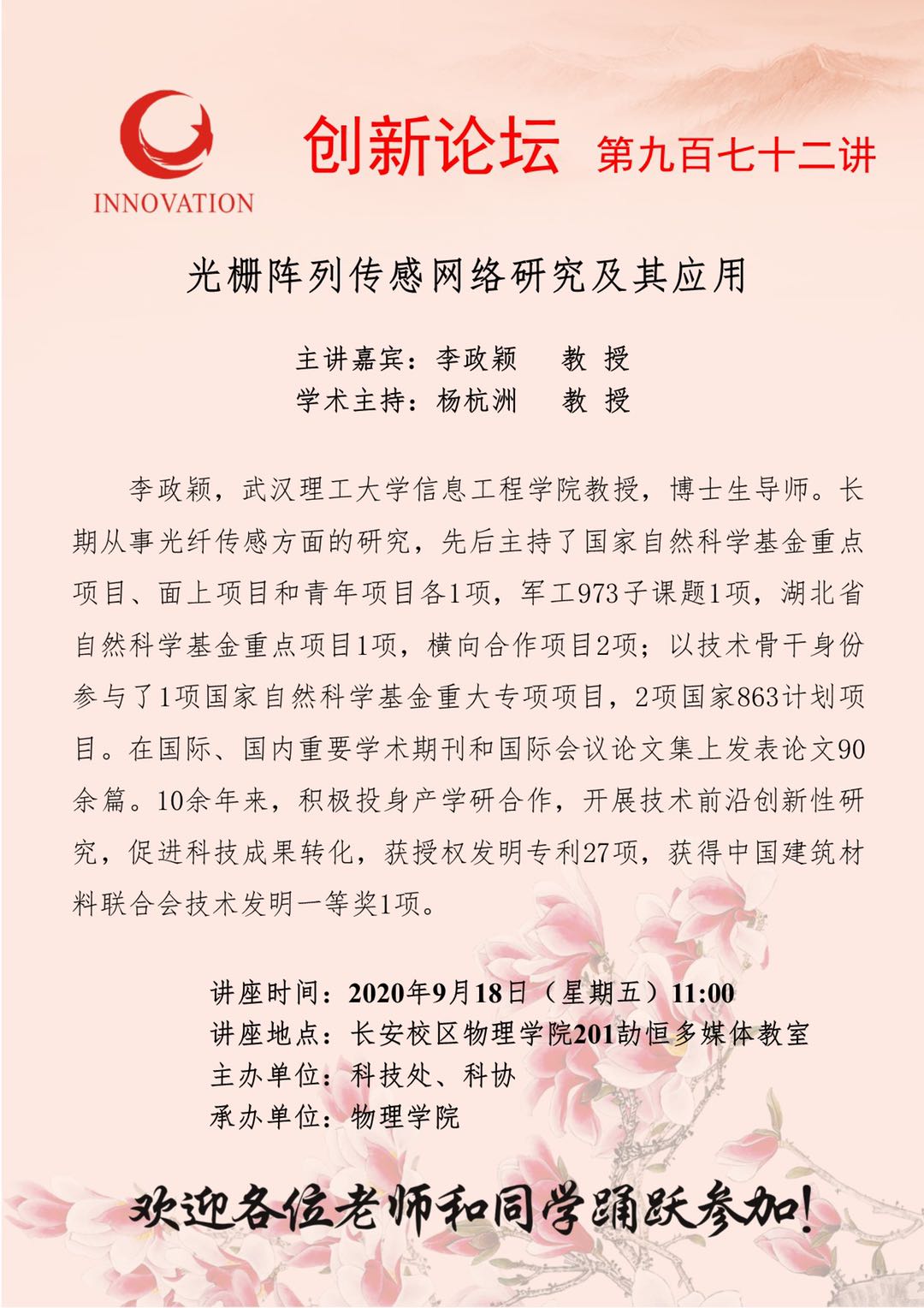 李政颖 教授 bat365正版唯一官网创新论坛第九百七十二讲:光栅阵列传感网络研究及其应用 讲座时间 2020年9月18日(星期五)11:00 讲座地点 长安校区物理学院201劼恒多媒体教室 讲座人介绍 李政颖 教授 讲座内容