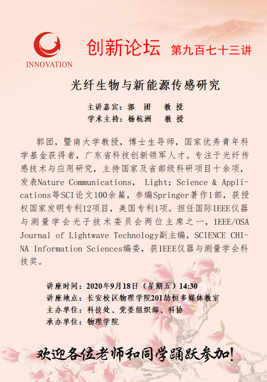 郭团 教授 bat365正版唯一官网创新论坛第九百七十三讲:光纤生物与新能源传感研究 讲座时间 2020年9月18日(星期五)14:30 讲座地点 长安校区物理学院201劼恒多媒体教室 讲座人介绍 郭团 教授 讲座内容