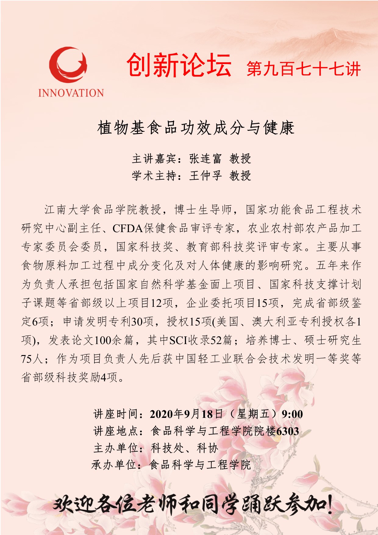 张连富 教授 bat365正版唯一官网创新论坛第九百七十七讲:植物基食品功效成分与健康 讲座时间 2020年9月18日(星期五)9:00 讲座地点 食品科学与工程学院院楼6303 讲座人介绍 张连富 教授 讲座内容