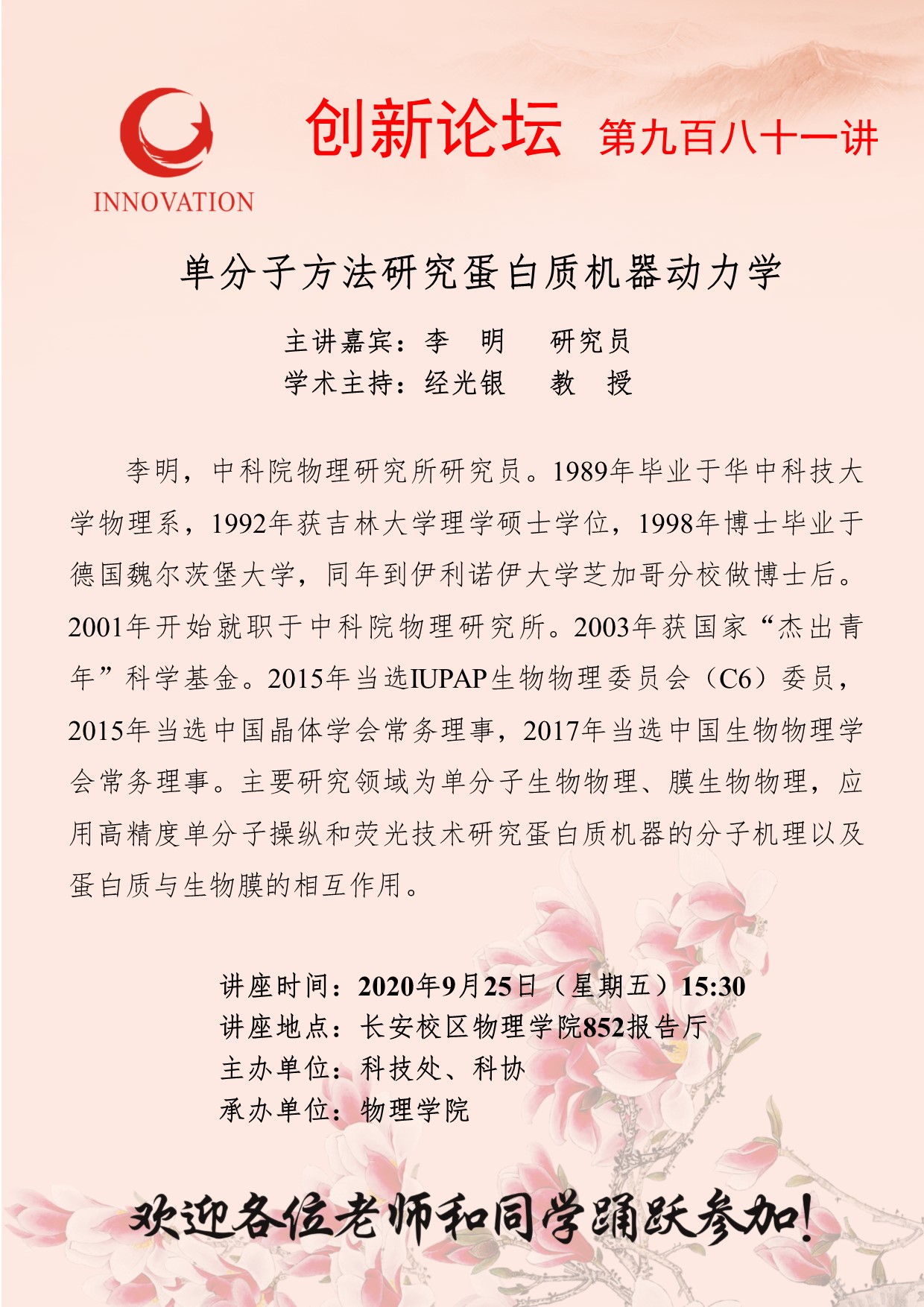 李 明 研究员 bat365正版唯一官网创新论坛第九百八十一讲:单分子方法研究蛋白质机器动力学 讲座时间 讲座时间:2020年9月25日(星期五)15:30 讲座地点 讲座地点:长安校区物理学院852报告厅 讲座人介绍 李 明 研究员 讲座内容