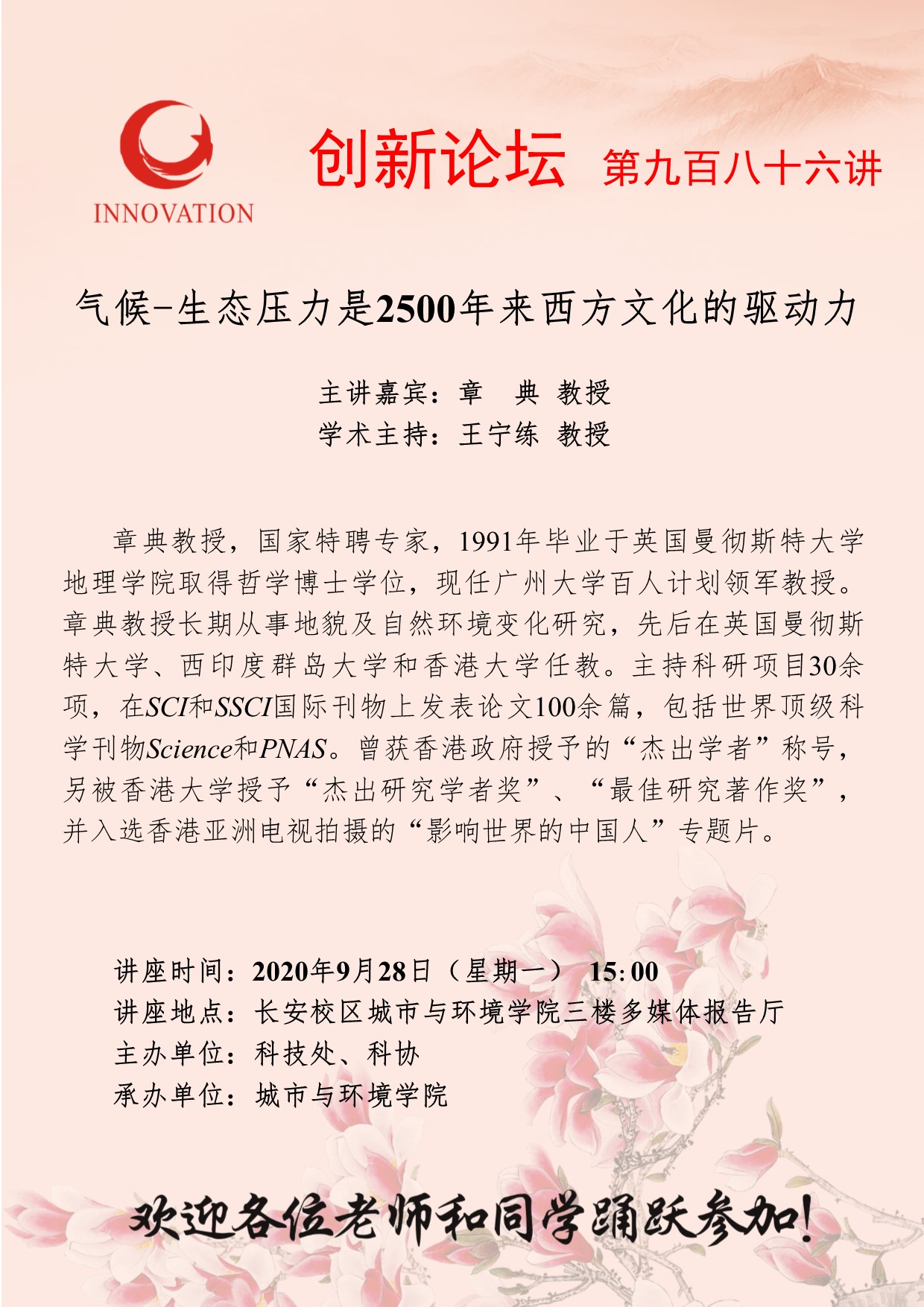 章 典 教授 bat365正版唯一官网创新论坛第九百八十六讲:气候-生态压力是2500年来西方文化的驱动力 讲座时间 2020年09月28日(星期一) 15:00 讲座地点 长安校区城市与环境学院三楼多媒体报告厅 讲座人介绍 章 典 教授 讲座内容