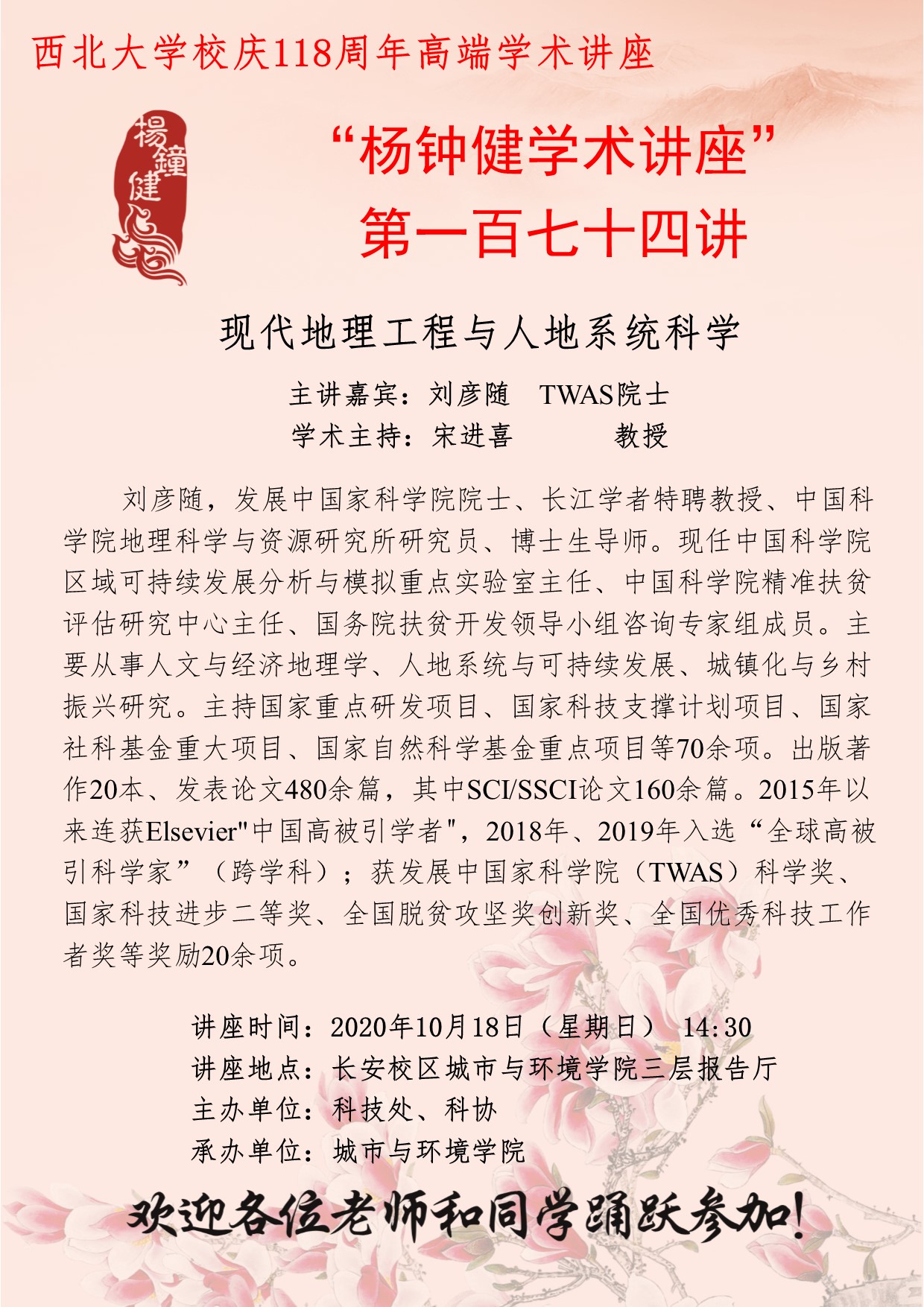 刘彦随 TWAS院士 “杨钟健学术讲座”第一百七十四讲暨校庆118周年高端学术讲座:现代地理工程与人地系统科学 讲座时间 2020年10月18日(星期日)14:30 讲座地点 长安校区城市与环境学院三层报告厅 讲座人介绍 刘彦随 TWAS院士 讲座内容