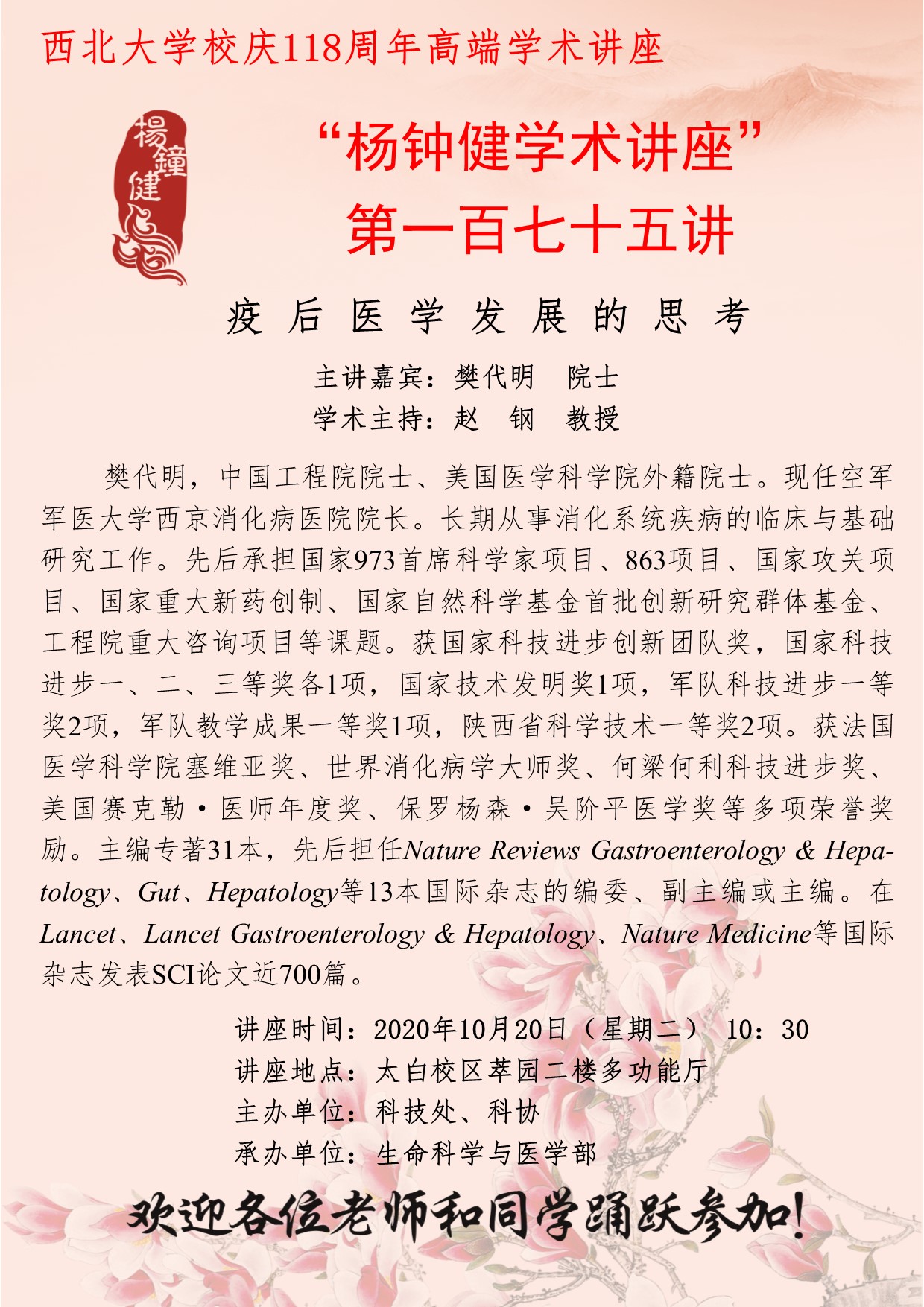 “杨钟健学术讲座”第一百七十五讲暨校庆118周年高端学术讲座:疫后医学发展的思考