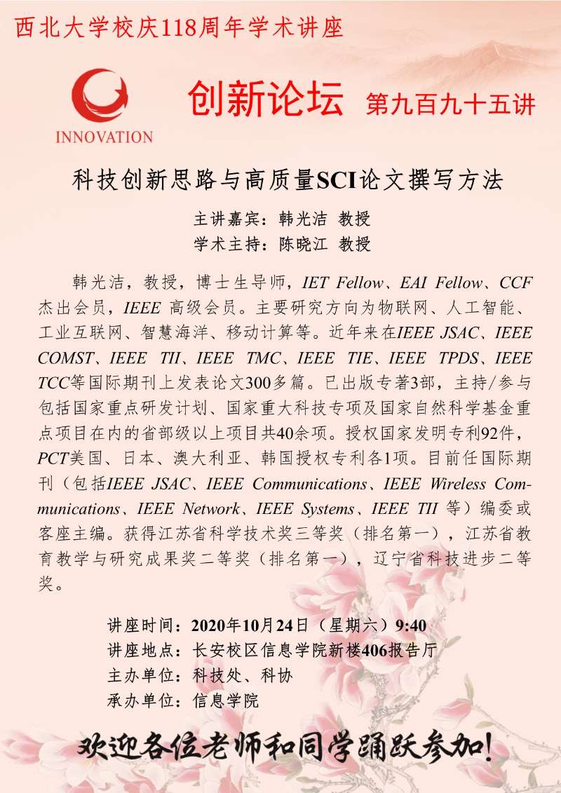 韩光洁 教授 bat365正版唯一官网创新论坛第九百九十五讲暨校庆118周年学术讲座:科技创新思路与高质量SCI论文撰写方法 讲座时间 2020年10月24日(星期六)9:40 讲座地点 长安校区信息学院新楼406报告厅 讲座人介绍 韩光洁 教授 讲座内容