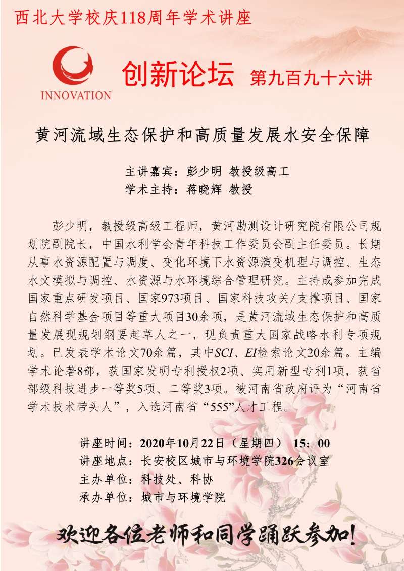 彭少明 教授级高工 bat365正版唯一官网创新论坛第九百九十六讲暨校庆118周年学术讲座:黄河流域生态保护和高质量发展水安全保障 讲座时间 2020年10月22日(星期四) 15:00 讲座地点 长安校区城市与环境学院326会议室 讲座人介绍 彭少明 教授级高工 讲座内容