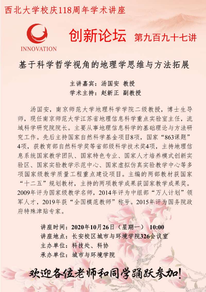 汤国安 教授 bat365正版唯一官网创新论坛第九百九十七讲暨校庆118周年学术讲座:基于科学哲学视角的地理学思维与方法拓展 讲座时间 2020年10月26日(星期一) 10:00 讲座地点 长安校区城市与环境学院326会议室 讲座人介绍 汤国安 教授 讲座内容
