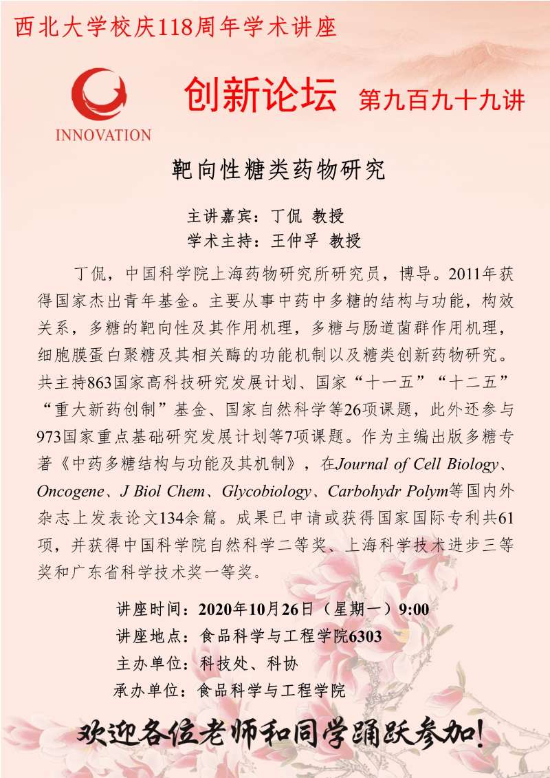 丁侃 教授 bat365正版唯一官网创新论坛第九百九十九讲暨校庆118周年学术讲座:靶向性糖类药物研究 讲座时间 2020年10月26日(星期一)9:00 讲座地点 食品科学与工程学院6303 讲座人介绍 丁侃 教授 讲座内容