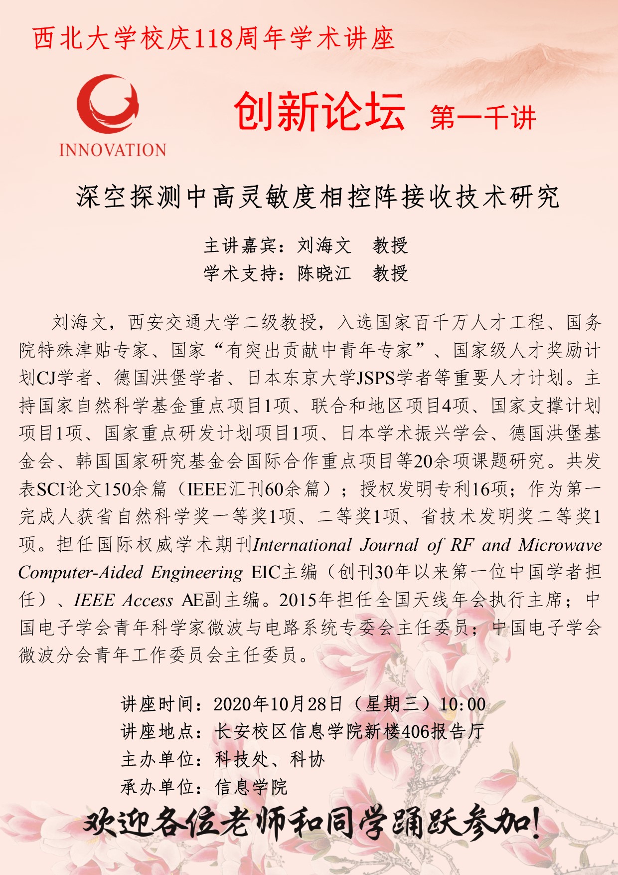 刘海文 教授 bat365正版唯一官网创新论坛第一千讲暨校庆118周年学术讲座:深空探测中高灵敏度相控阵接收技术研究 讲座时间 2020年10月28日(星期三)10:00 讲座地点 长安校区信息学院新楼406报告厅 讲座人介绍 刘海文 教授 讲座内容