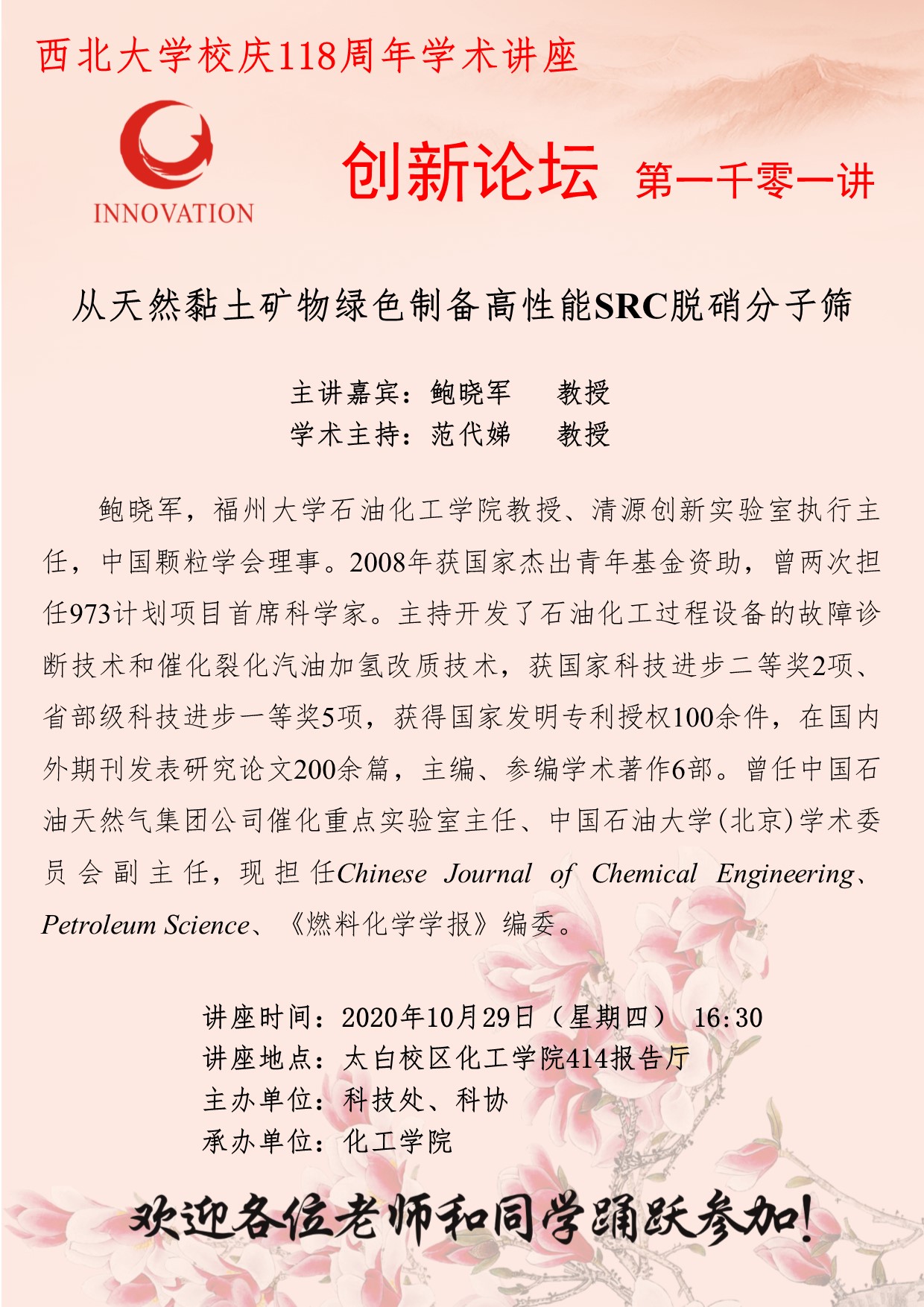 鲍晓军 教授 bat365正版唯一官网创新论坛第一千零一讲暨校庆118周年学术讲座:从天然黏土矿物绿色制备高性能SRC脱硝分子筛 讲座时间 2020年10月29日(星期四) 16:30 讲座地点 太白校区化工学院414报告厅 讲座人介绍 鲍晓军 教授 讲座内容