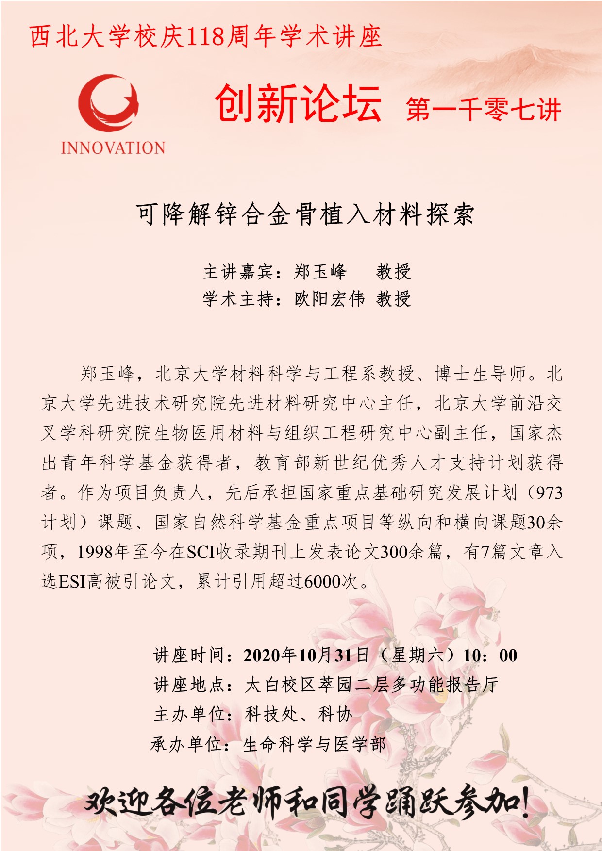 郑玉峰 教授 bat365正版唯一官网创新论坛第一千零七讲暨校庆118周年学术讲座:可降解锌合金骨植入材料探索 讲座时间 2020年10月31日(星期六)10:00 讲座地点 太白校区萃园二层多功能报告厅 讲座人介绍 郑玉峰 教授 讲座内容
