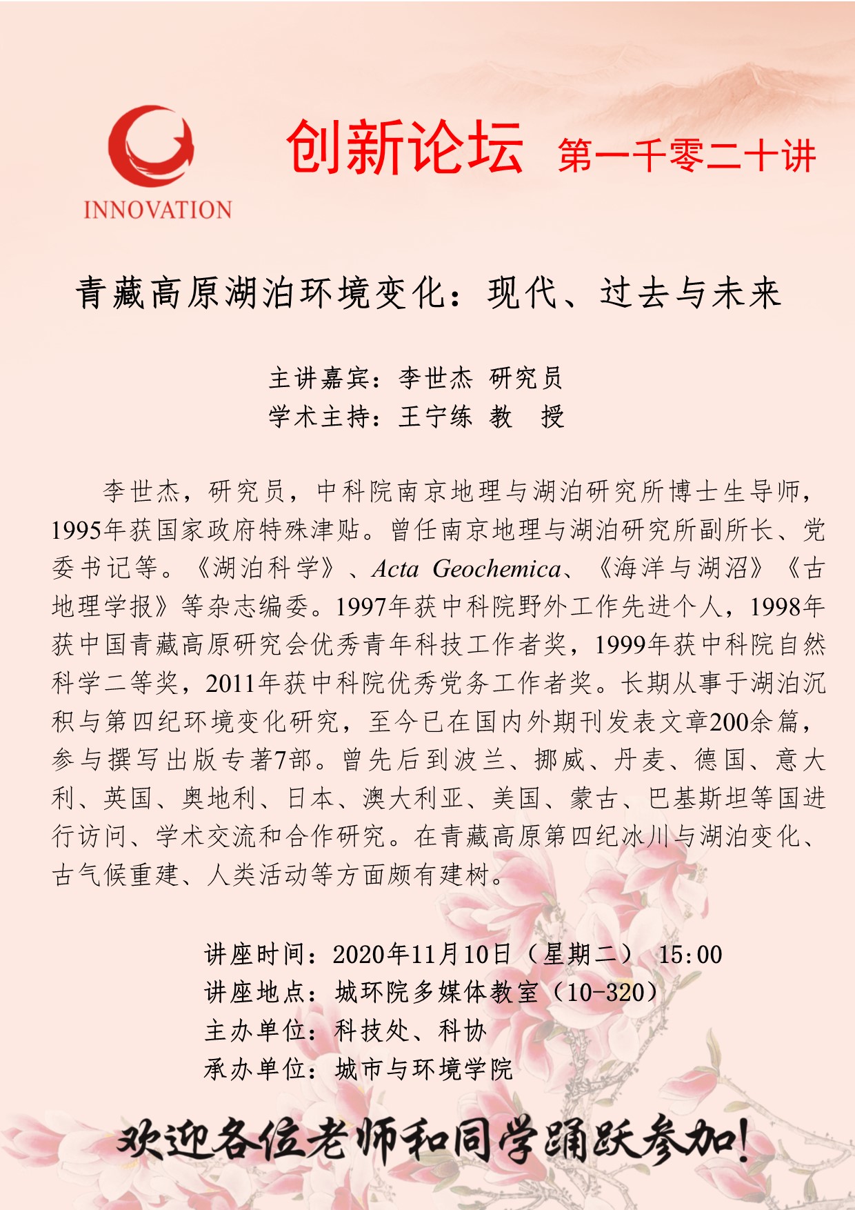 李世杰 研究员 bat365正版唯一官网创新论坛第一千零二十讲:青藏高原湖泊环境变化:现代、过去与未来 讲座时间 2020年11月10日(星期二) 15:00 讲座地点 城环院多媒体教室(10-320) 讲座人介绍 李世杰 研究员 讲座内容