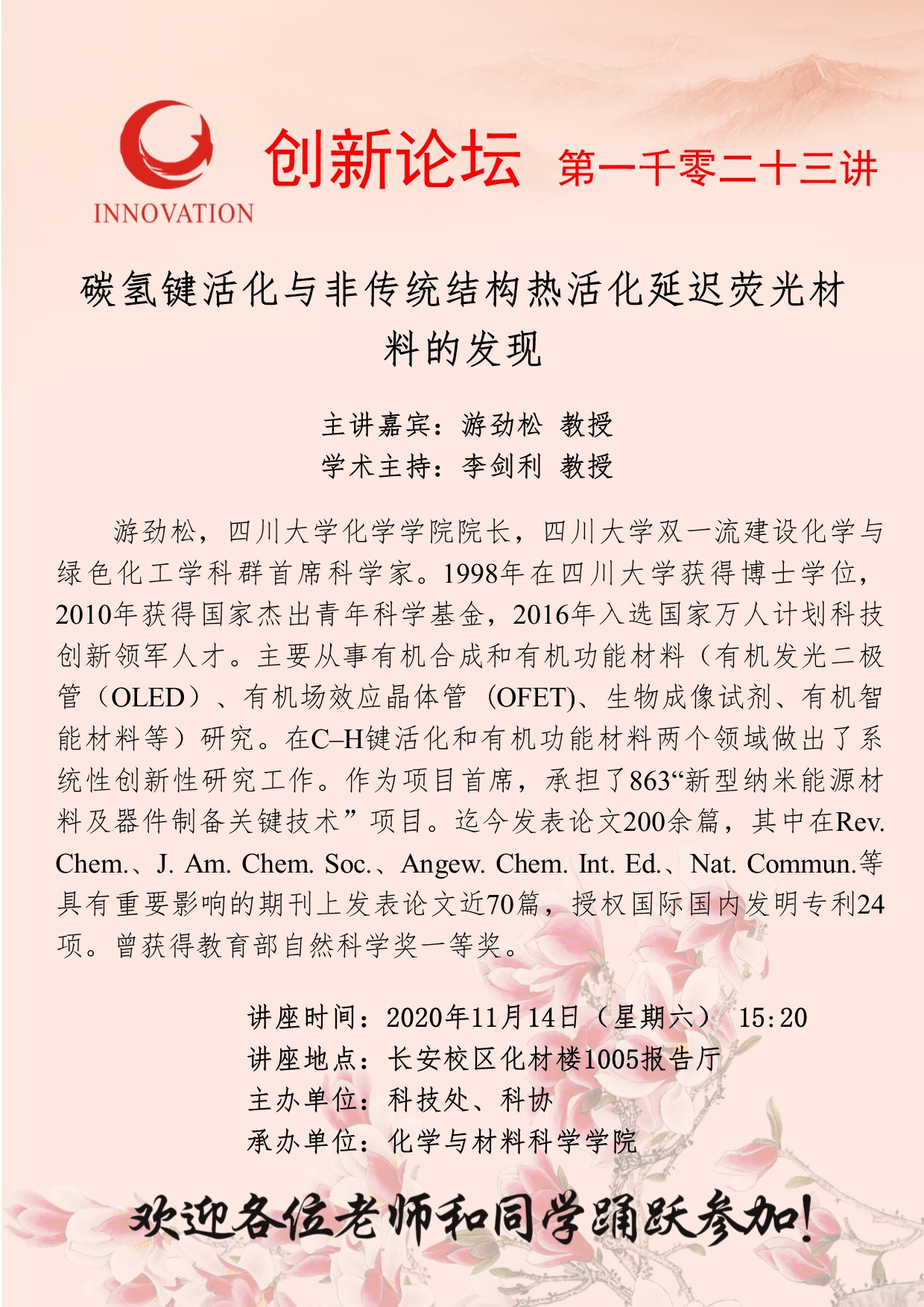 游劲松 教授 bat365正版唯一官网创新论坛第一千零二十三讲:碳氢键活化与非传统结构热活化延迟荧光材料的发现 讲座时间 2020年 11月14日(周六)15:20 讲座地点 长安校区化材楼1005报告厅 讲座人介绍 游劲松 教授 讲座内容