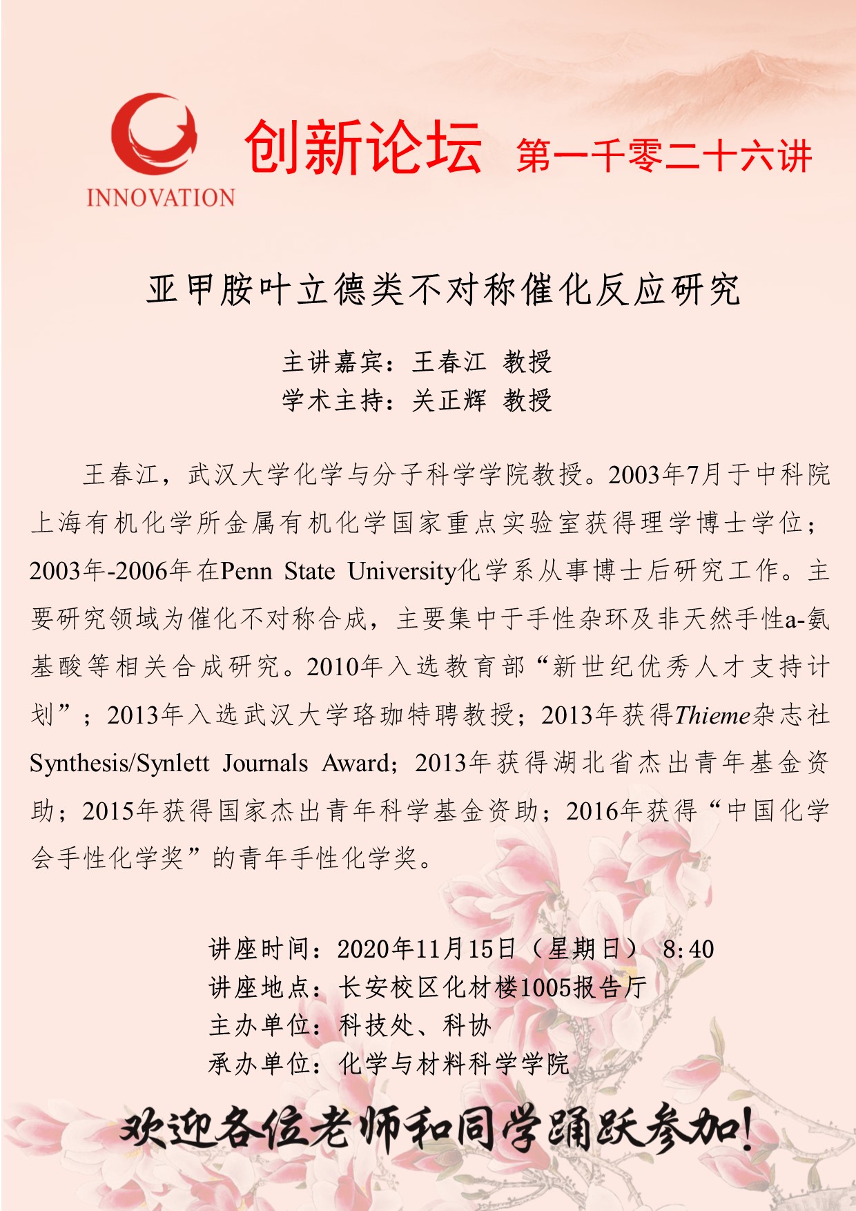 王春江 教授 bat365正版唯一官网创新论坛第一千零二十六讲:亚甲胺叶立德类不对称催化反应研究 讲座时间 2020年 11月15日(星期日)8:40 讲座地点 长安校区化材楼1005报告厅 讲座人介绍 王春江 教授 讲座内容