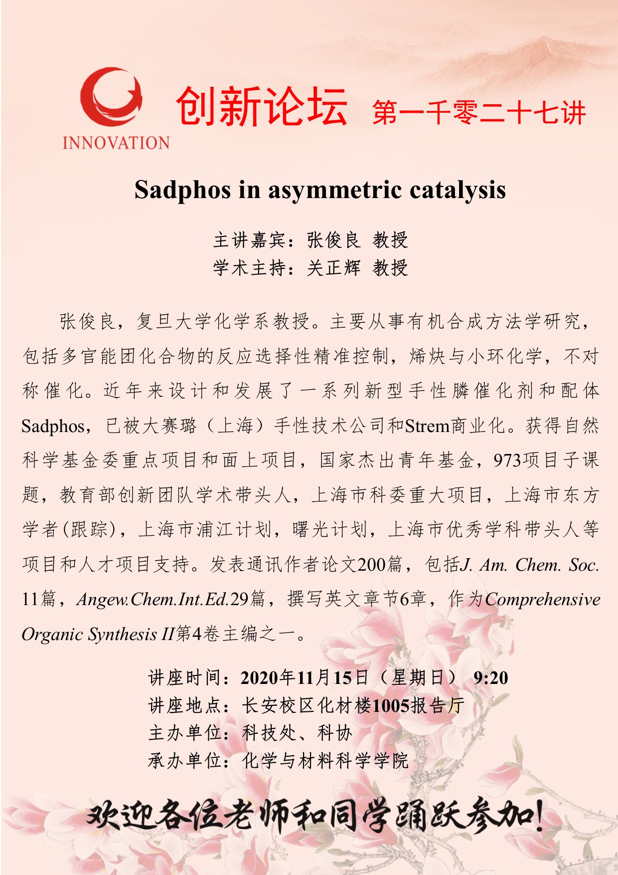 张俊良 教授 bat365正版唯一官网创新论坛第一千零二十七讲:Sadphos in asymmetric catalysis 讲座时间 2020年11月15日(星期日)9:20 讲座地点 长安校区化材楼1005报告厅 讲座人介绍 张俊良 教授 讲座内容