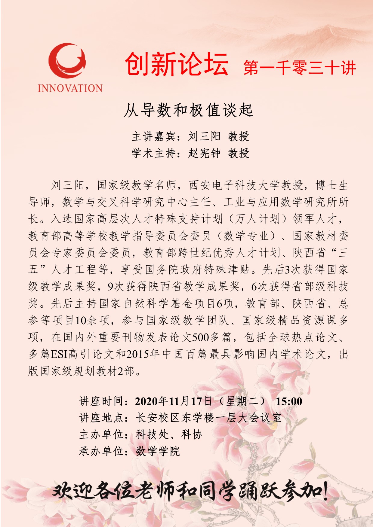 刘三阳 教授 bat365正版唯一官网创新论坛第一千零三十讲:从导数和极值谈起 讲座时间 2020年11月17日(星期二) 15:00 讲座地点 长安校区东学楼一层大会议室 讲座人介绍 刘三阳 教授 讲座内容