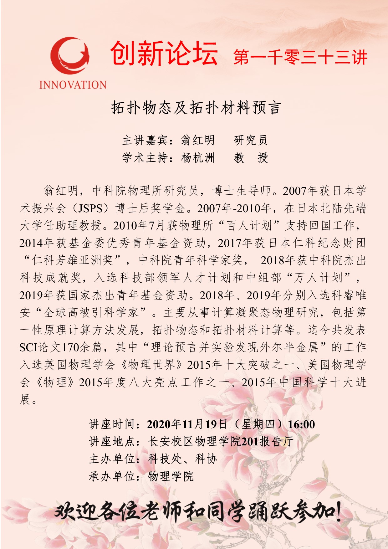翁红明 研究员 bat365正版唯一官网创新论坛第一千零三十三讲:拓扑物态及拓扑材料预言 讲座时间 2020年11月19日(星期四)16:00 讲座地点 长安校区物理学院201报告厅 讲座人介绍 翁红明 研究员 讲座内容