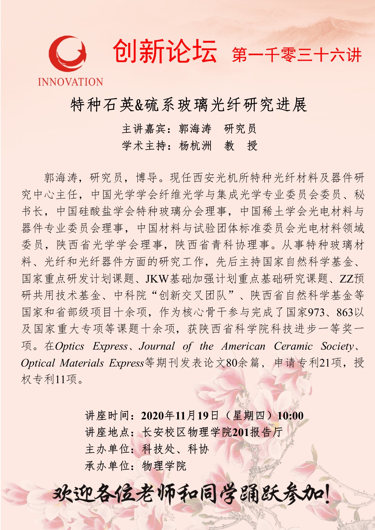 郭海涛 研究员 bat365正版唯一官网创新论坛第一千零三十六讲:特种石英&硫系玻璃光纤研究进展 讲座时间 2020年11月19日(星期四)10:00 讲座地点 长安校区物理学院201报告厅 讲座人介绍 郭海涛 研究员 讲座内容