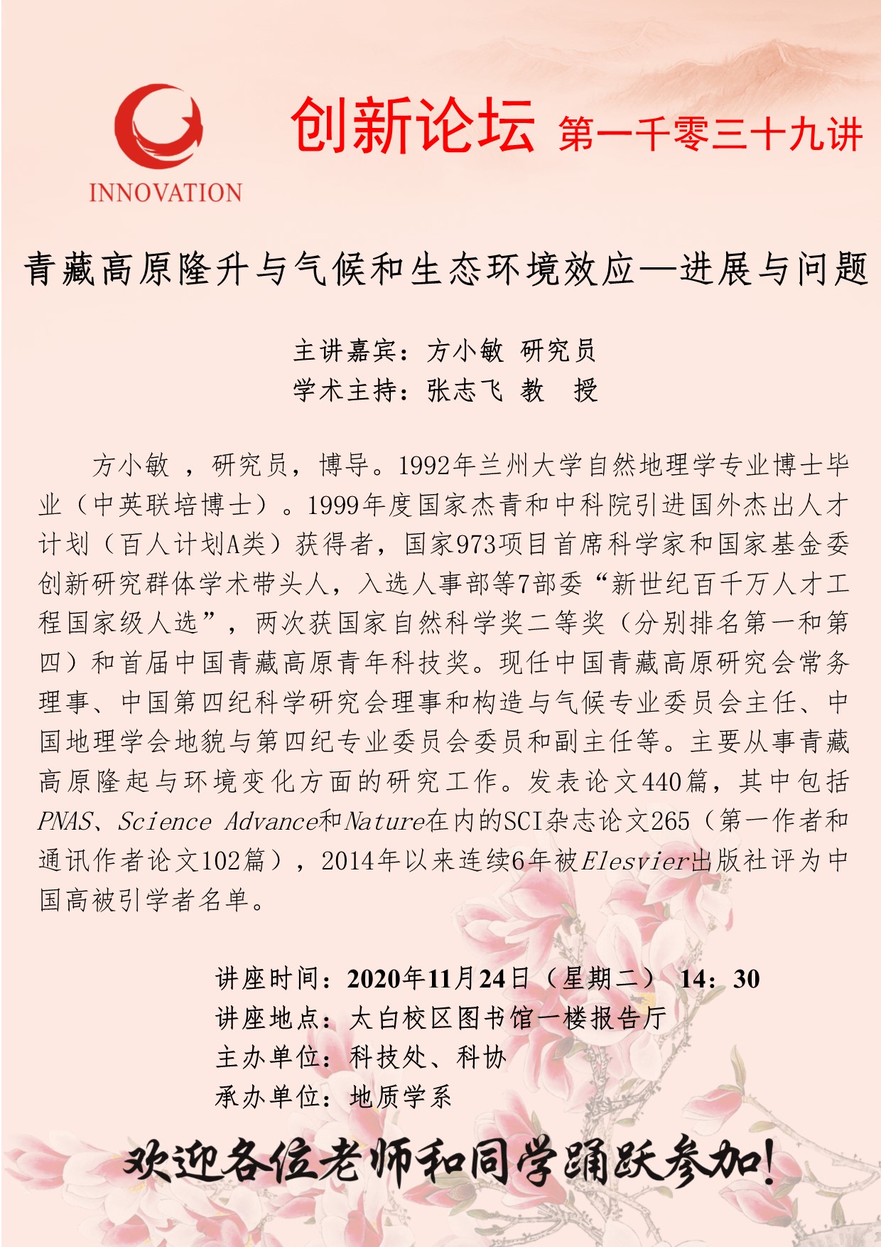 方小敏 研究员 bat365正版唯一官网创新论坛第一千零三十九讲:青藏高原隆升与气候和生态环境效应—进展与问题 讲座时间 2020年11月24日(星期二)14:30 讲座地点 太白校区图书馆一楼报告厅 讲座人介绍 方小敏 研究员 讲座内容