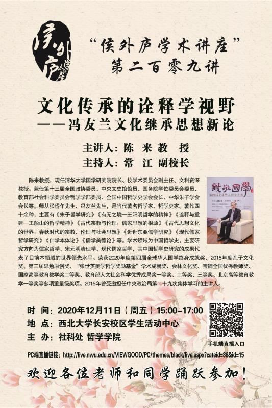 陈 来 教 授 侯外庐学术讲座第二百零九讲:文化传承的诠释学视野——冯友兰文化继承思想新论 讲座时间 2020年12月11日(周五)15:00-17:00 讲座地点 bat365正版唯一官网长安校区学生活动中心 讲座人介绍 陈 来 教 授 讲座内容