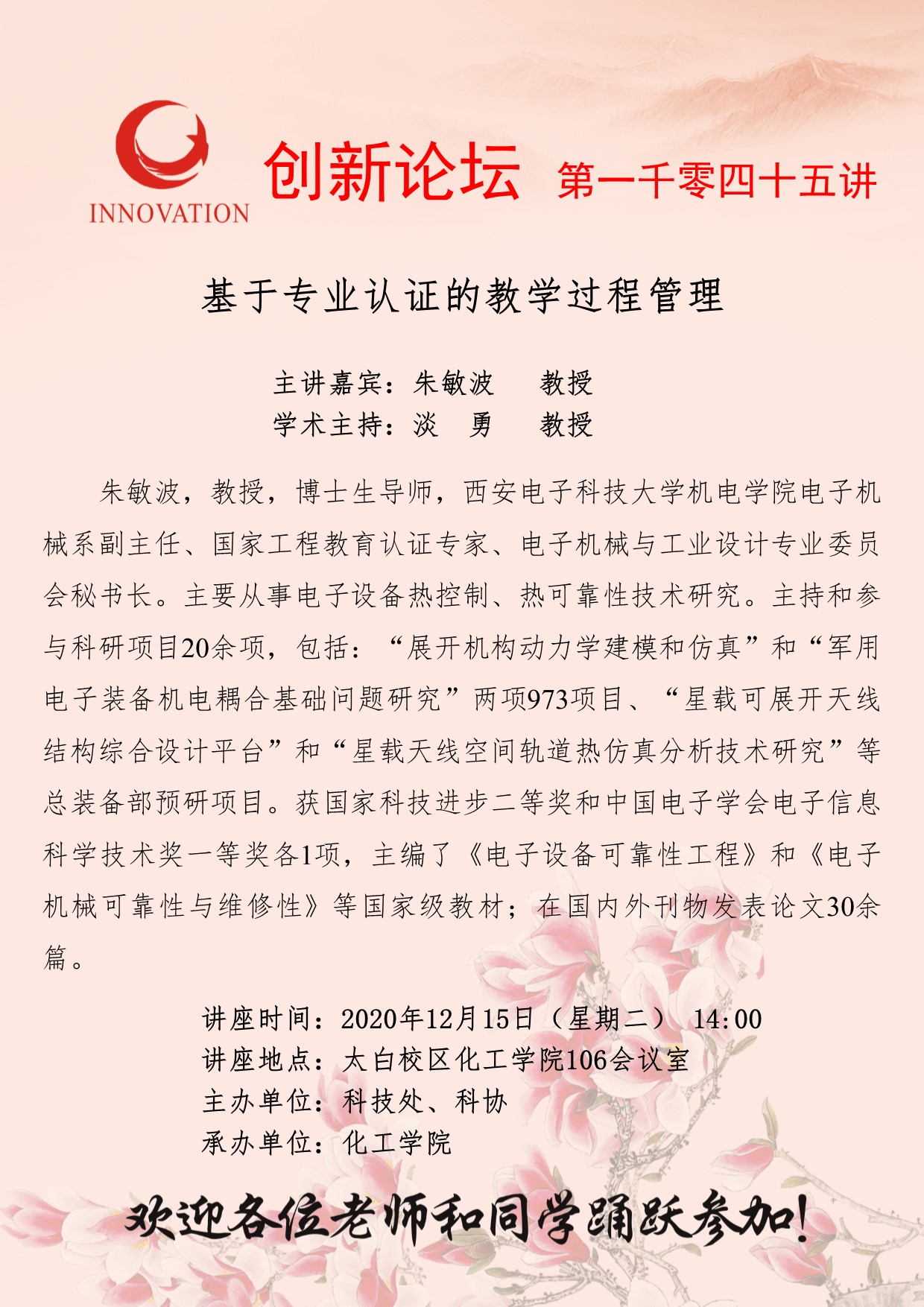 朱敏波 教授 bat365正版唯一官网创新论坛第一千零四十五讲:基于专业认证的教学过程管理 讲座时间 2020年12月15日(星期二) 14:00 讲座地点 太白校区化工学院106会议室 讲座人介绍 朱敏波 教授 讲座内容