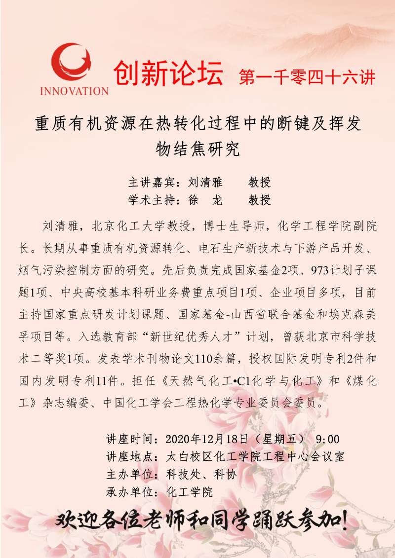 刘清雅 教授 bat365正版唯一官网创新论坛第一千零四十六讲:重质有机资源在热转化过程中的断键及挥发物结焦研究 讲座时间 2020年12月18日(星期五) 9:00 讲座地点 太白校区化工学院工程中心会议室 讲座人介绍 刘清雅 教授 讲座内容