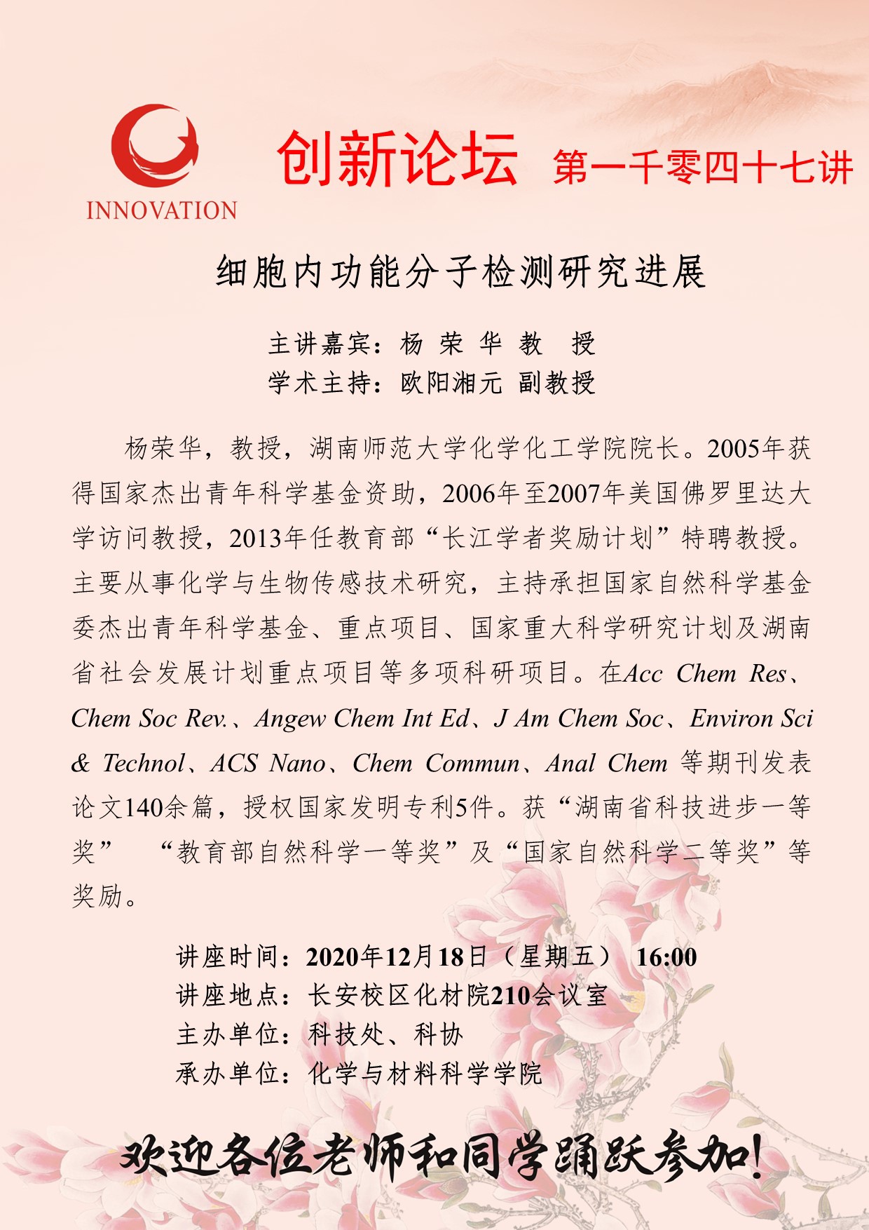 杨荣华 教授 bat365正版唯一官网创新论坛第一千零四十七讲:细胞内功能分子检测研究进展 讲座时间 2020年12月18日(星期五) 16:00 讲座地点 长安校区化材院210会议室 讲座人介绍 杨荣华 教授 讲座内容