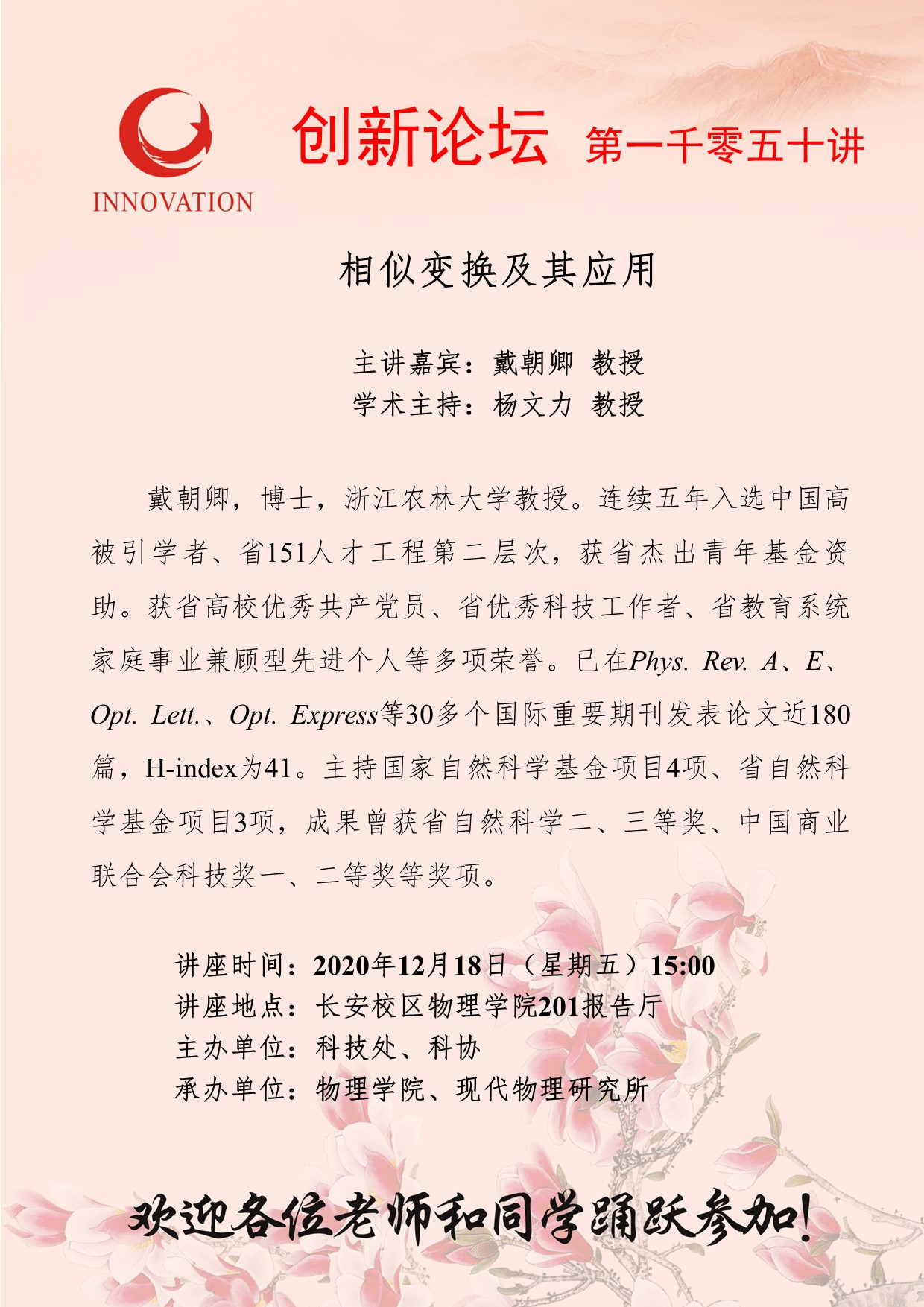 戴朝卿 教授 bat365正版唯一官网创新论坛第一千零五十讲:相似变换及其应用 讲座时间 2020年12月18日(星期五)15:00 讲座地点 长安校区物理学院201报告厅 讲座人介绍 戴朝卿 教授 讲座内容