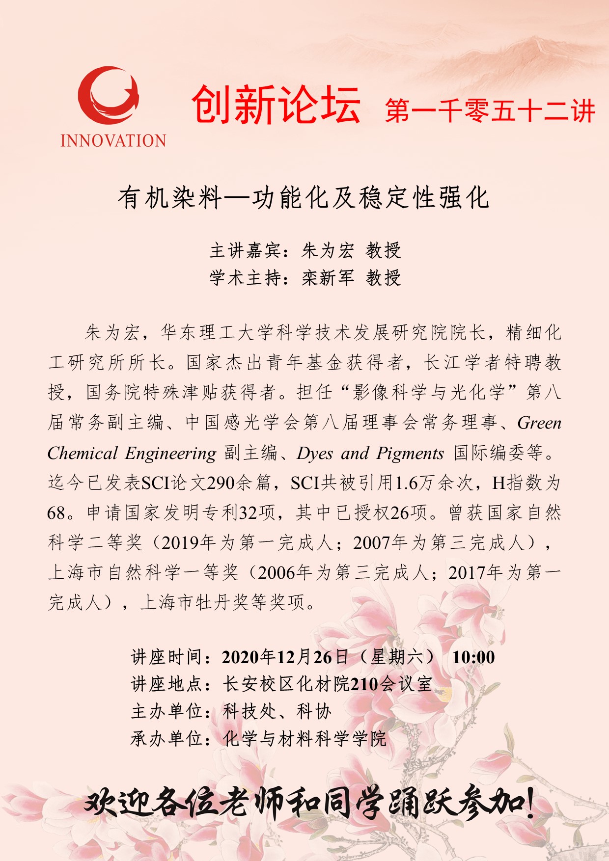 朱为宏 教授 bat365正版唯一官网创新论坛第一千零五十二讲: 有机染料—功能化及稳定性强化 讲座时间 2020年12月26日(星期六) 10:00 讲座地点 长安校区化材院210会议室 讲座人介绍 朱为宏 教授 讲座内容