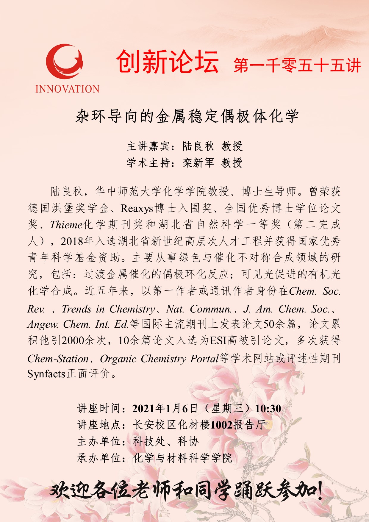 陆良秋 教授 bat365正版唯一官网创新论坛第一千零五十五讲:杂环导向的金属稳定偶极体化学 讲座时间 2021年1月6日(星期三)10:30 讲座地点 长安校区化材楼1002报告厅 讲座人介绍 陆良秋 教授 讲座内容
