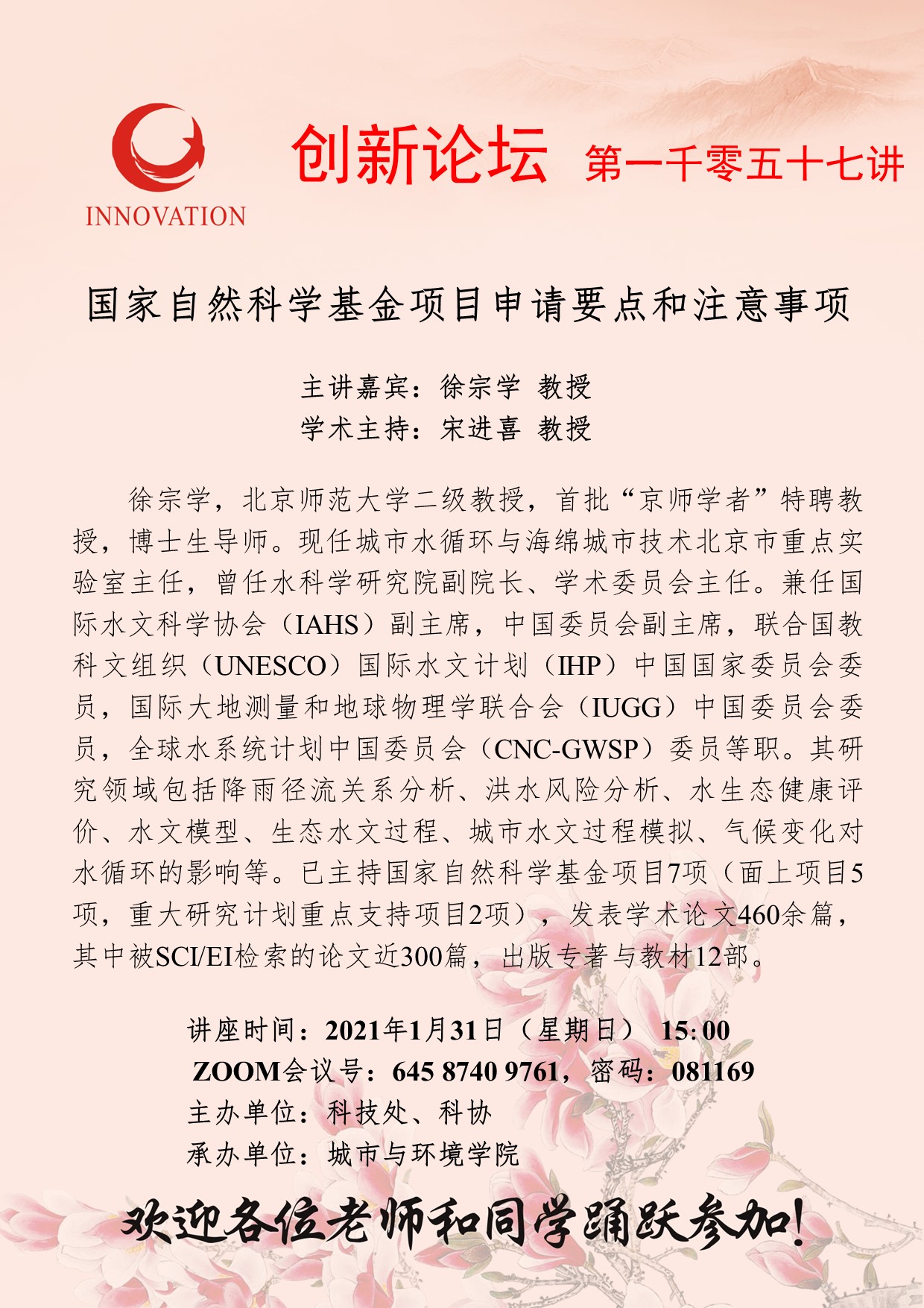 徐宗学 教授 bat365正版唯一官网创新论坛第一千零五十七讲:国家自然科学基金项目申请要点和注意事项 讲座时间 2021年1月31日(星期日) 15:00 讲座地点 ZOOM会议号:64587409761,密码:081169 讲座人介绍 徐宗学 教授 讲座内容