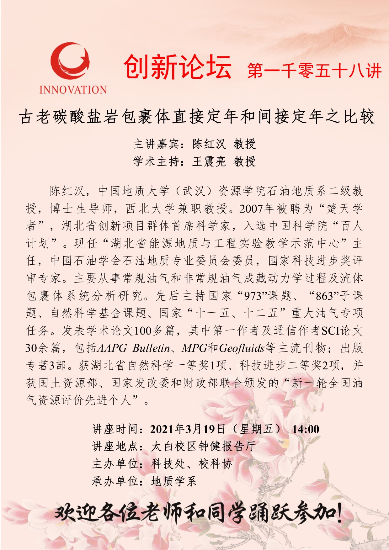 陈红汉 教授 bat365正版唯一官网创新论坛第一千零五十八讲:古老碳酸盐岩包裹体直接定年和间接定年之比较 讲座时间 2021年3月19日(星期五) 14:00 讲座地点 太白校区钟健报告厅 讲座人介绍 陈红汉 教授 讲座内容