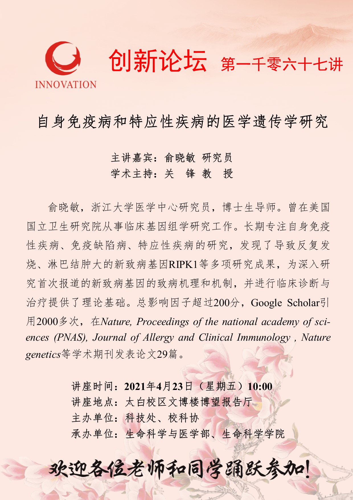 俞晓敏 研究员 bat365正版唯一官网创新论坛第一千零六十七讲:自身免疫病和特应性疾病的医学遗传学研究 讲座时间 2021年4月23日(星期五)10:00 讲座地点 太白校区文博楼博望报告厅 讲座人介绍 俞晓敏 研究员 讲座内容