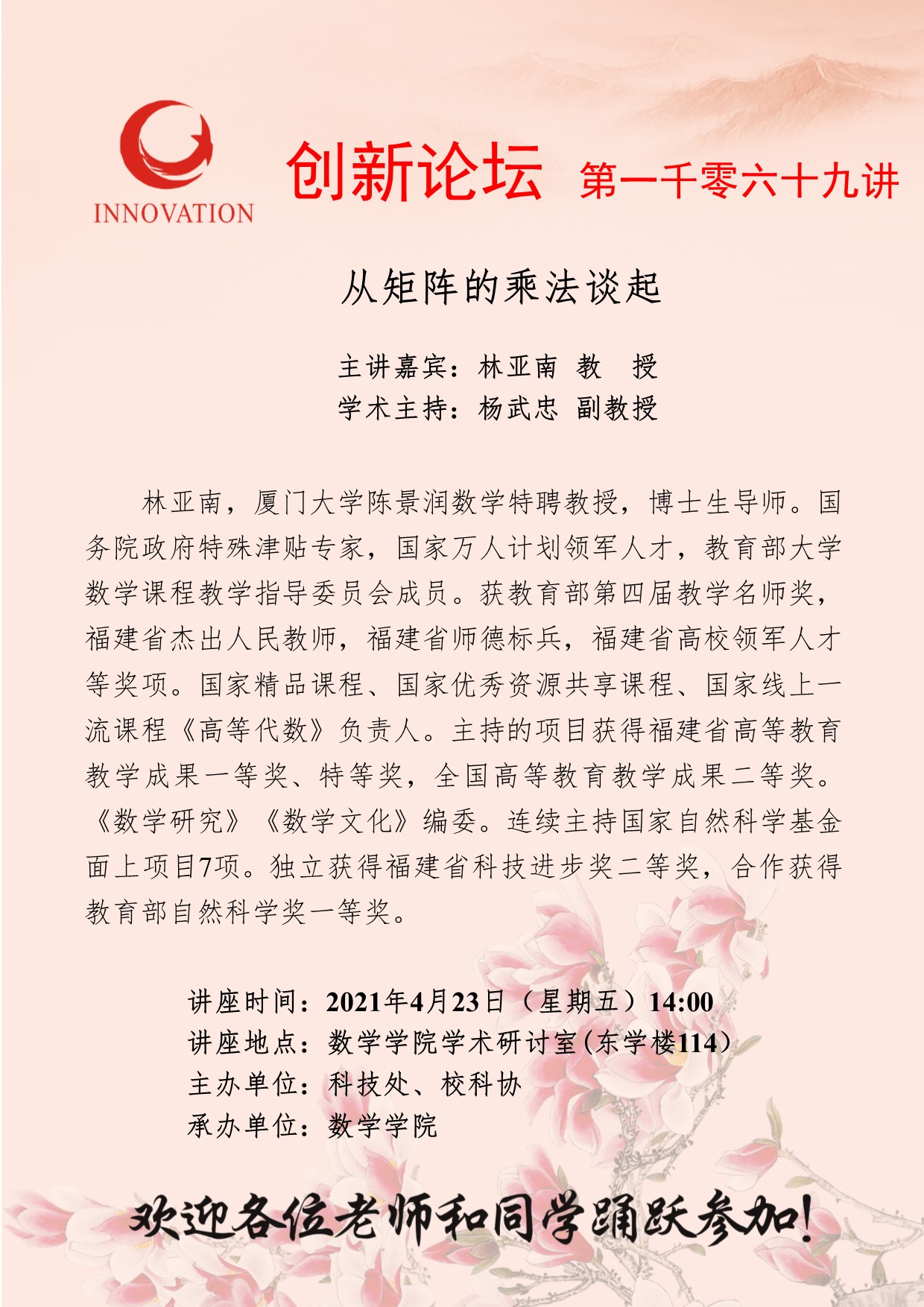 林亚南 教授 bat365正版唯一官网创新论坛第一千零六十九讲:从矩阵的乘法谈起 讲座时间 2021年4月23日(星期五)14:00 讲座地点 数学学院学术研讨室(东学楼114) 讲座人介绍 林亚南 教授 讲座内容