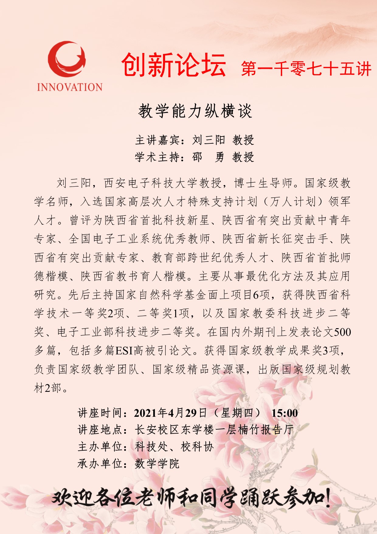 刘三阳 教授 bat365正版唯一官网创新论坛第一千零七十五讲:教学能力纵横谈 讲座时间 2021年4月29日(星期四) 15:00 讲座地点 长安校区东学楼一层楠竹报告厅 讲座人介绍 刘三阳 教授 讲座内容