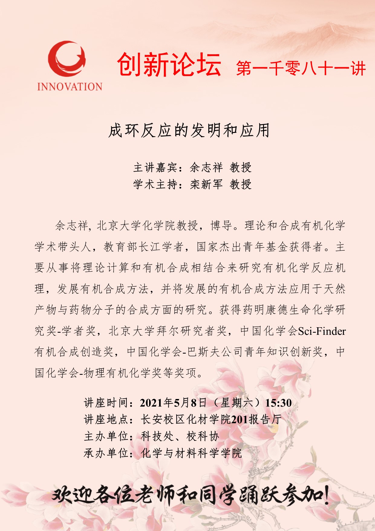 余志祥 教授 bat365正版唯一官网创新论坛第一千零八十一讲:成环反应的发明和应用 讲座时间 2021年5月8日(星期六)15:30 讲座地点 长安校区化材学院201报告厅 讲座人介绍 余志祥 教授 讲座内容