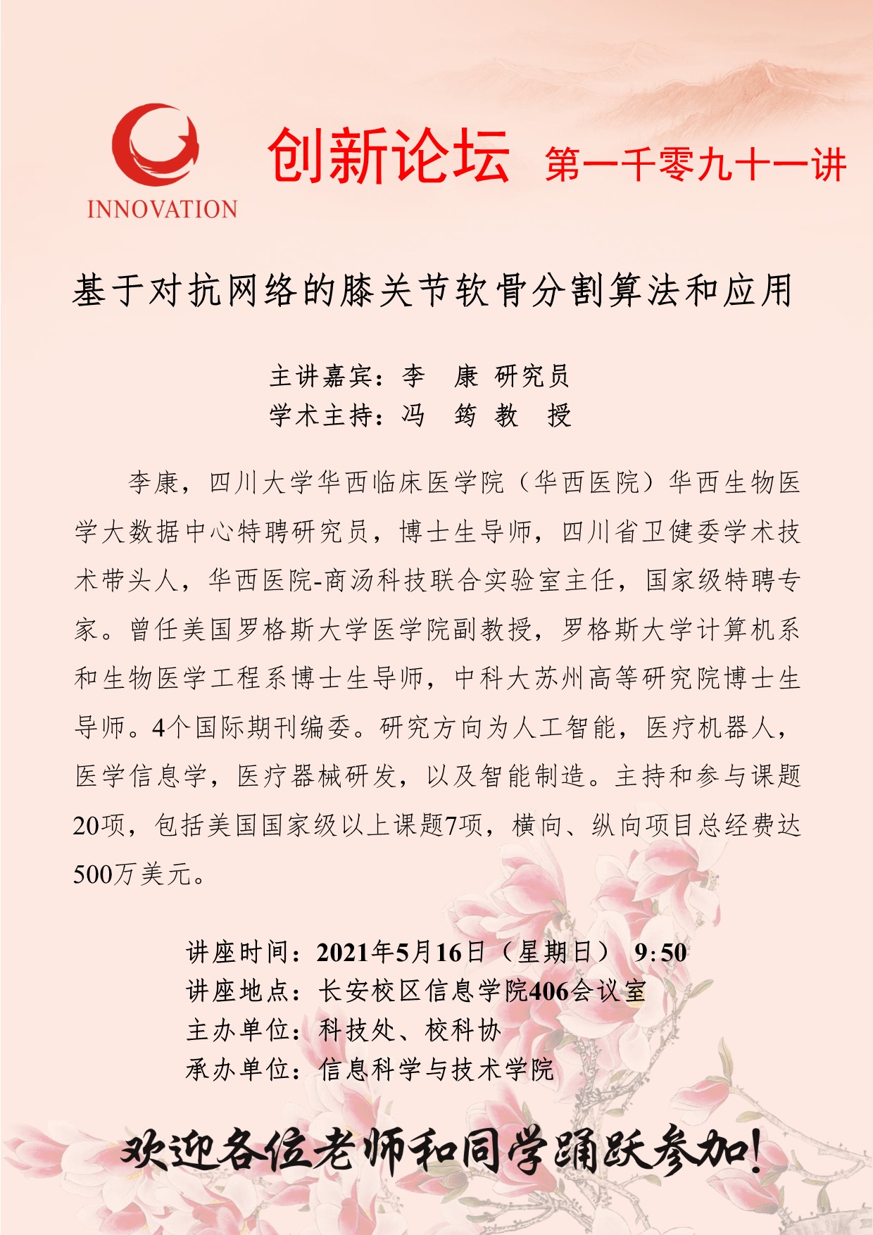 李 康 研究员 bat365正版唯一官网创新论坛第一千零九十一讲:基于对抗网络的膝关节软骨分割算法和应用 讲座时间 2021年5月16日(星期日) 9:50 讲座地点 长安校区信息学院406会议室 讲座人介绍 李 康 研究员 讲座内容