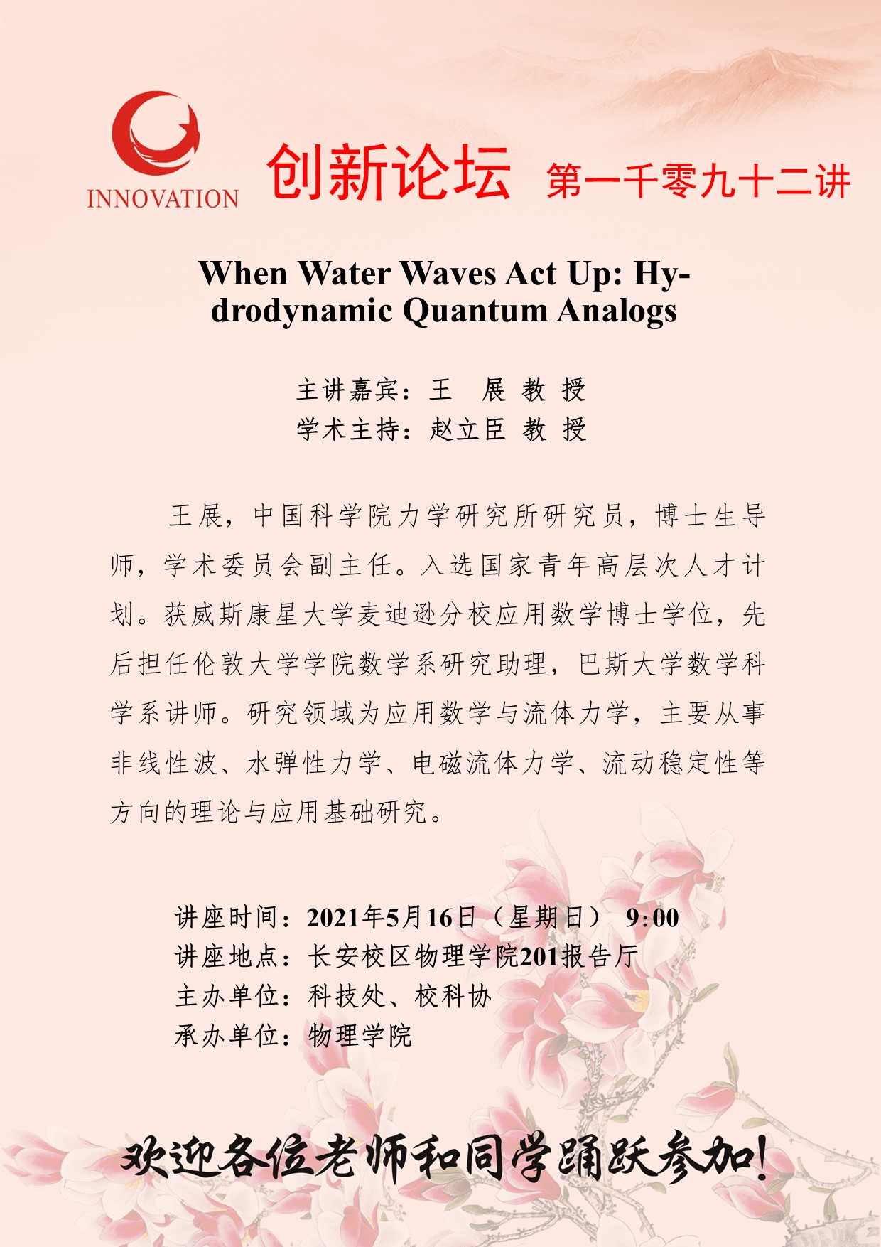王 展 教 授 bat365正版唯一官网创新论坛第一千零九十二讲:When Water Waves Act Up: Hydrodynamic Quantum Analogs 讲座时间 2021年5月16日(星期日) 9:00 讲座地点 长安校区物理学院201报告厅 讲座人介绍 王 展 教 授 讲座内容