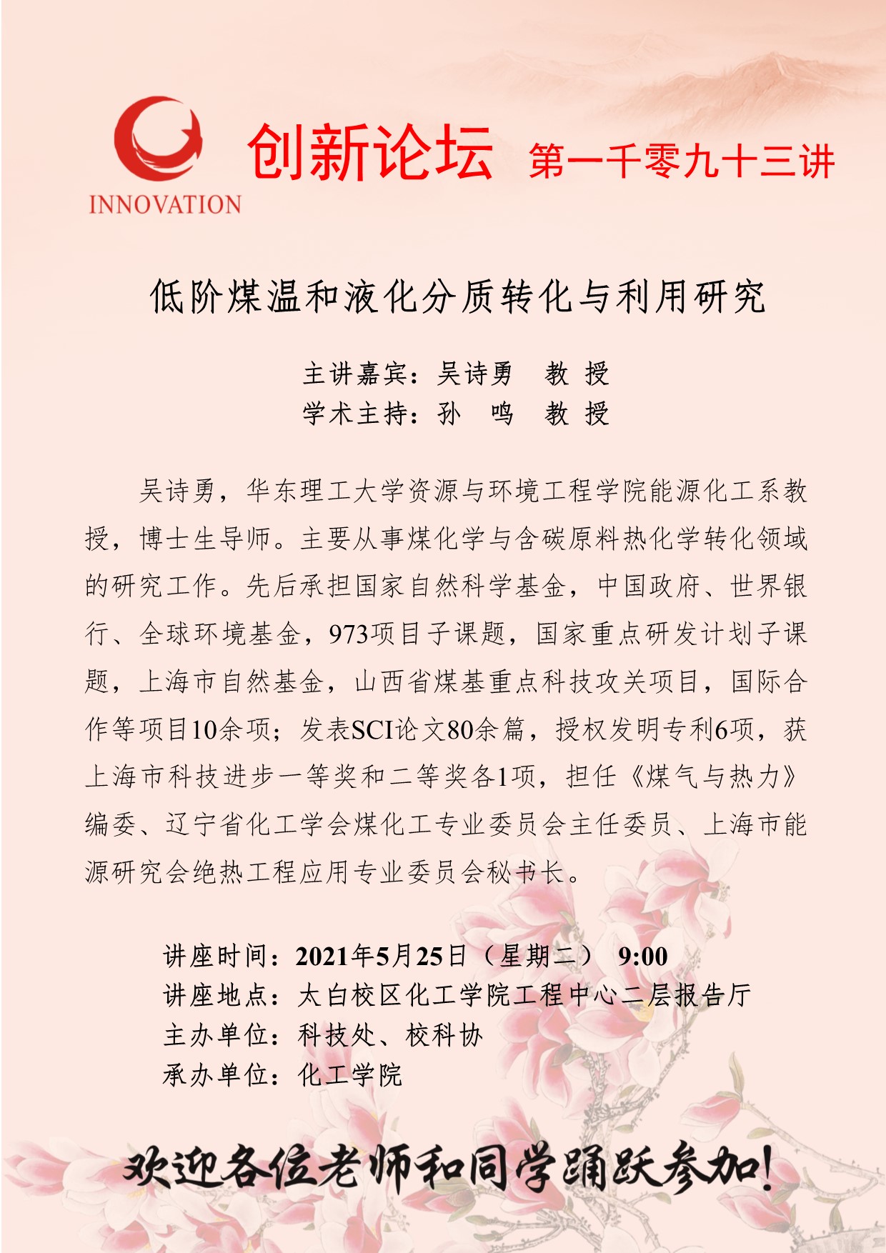 吴诗勇 教 授 bat365正版唯一官网创新论坛第一千零九十三讲:低阶煤温和液化分质转化与利用研究 讲座时间 2021年5月25日(星期二) 9:00 讲座地点 太白校区化工学院工程中心二层报告厅 讲座人介绍 吴诗勇 教 授 讲座内容