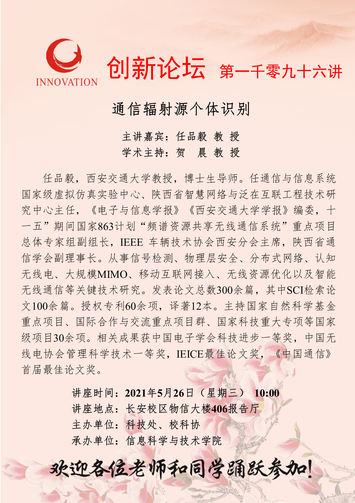 任品毅 教 授 bat365正版唯一官网创新论坛第一千零九十六讲:通信辐射源个体识别 讲座时间 2021年5月26日(星期三) 10:00 讲座地点 长安校区物信大楼406报告厅 讲座人介绍 任品毅 教 授 讲座内容