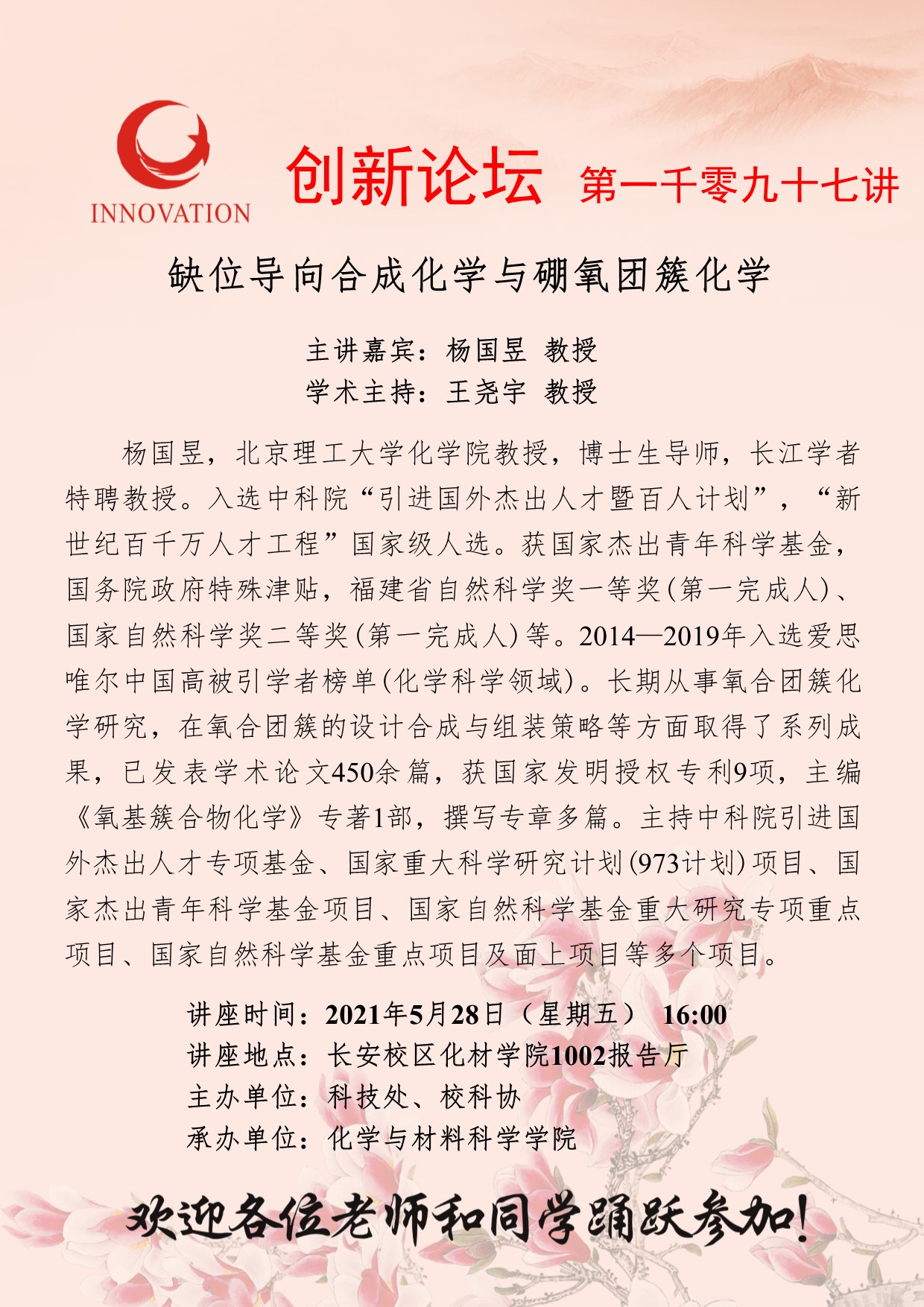 杨国昱 教授 bat365正版唯一官网创新论坛第一千零九十七讲:缺位导向合成化学与硼氧团簇化学 讲座时间 2021年5月28日(星期五) 16:00 讲座地点 长安校区化材学院1002报告厅 讲座人介绍 杨国昱 教授 讲座内容