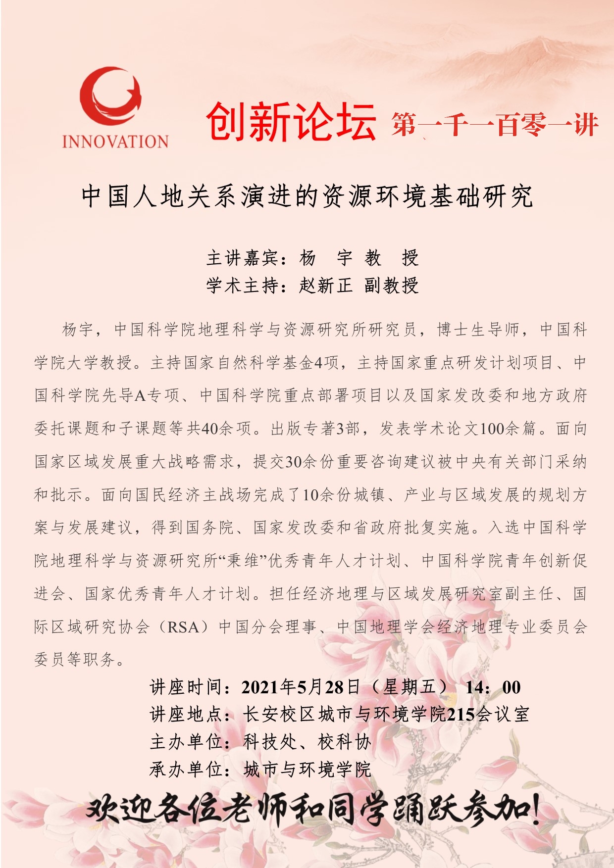 杨宇 教授 bat365正版唯一官网创新论坛第一千一百零一讲:中国人地关系演进的资源环境基础研究 讲座时间 2021年5月28日(星期五)14:00 讲座地点 长安校区城市与环境学院215会议室 讲座人介绍 杨宇 教授 讲座内容