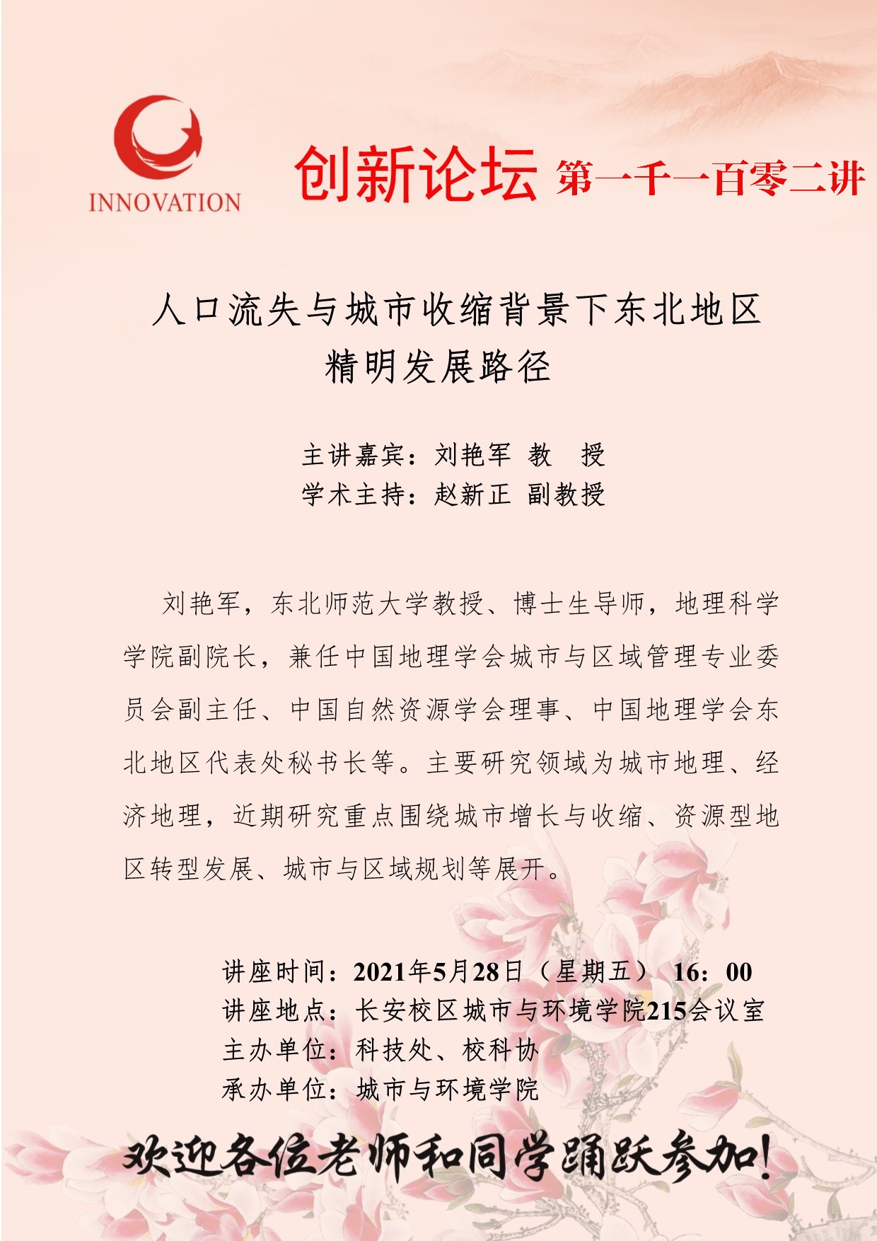 刘艳军 教授 bat365正版唯一官网创新论坛第一千一百零二讲:人口流失与城市收缩背景下东北地区精明发展路径 讲座时间 2021年5月28日(星期五)16:00 讲座地点 长安校区城市与环境学院215会议室 讲座人介绍 刘艳军 教授 讲座内容