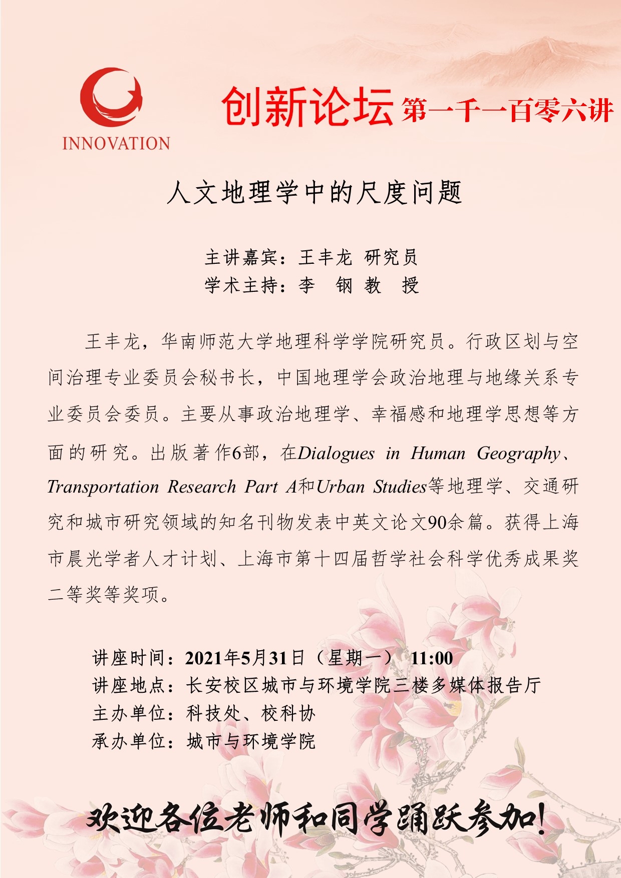 王丰龙 研究员 bat365正版唯一官网创新论坛第一千一百零六讲:人文地理学中的尺度问题 讲座时间 2021年5月31日(星期一) 11:00 讲座地点 长安校区城市与环境学院三楼多媒体报告厅 讲座人介绍 王丰龙 研究员 讲座内容