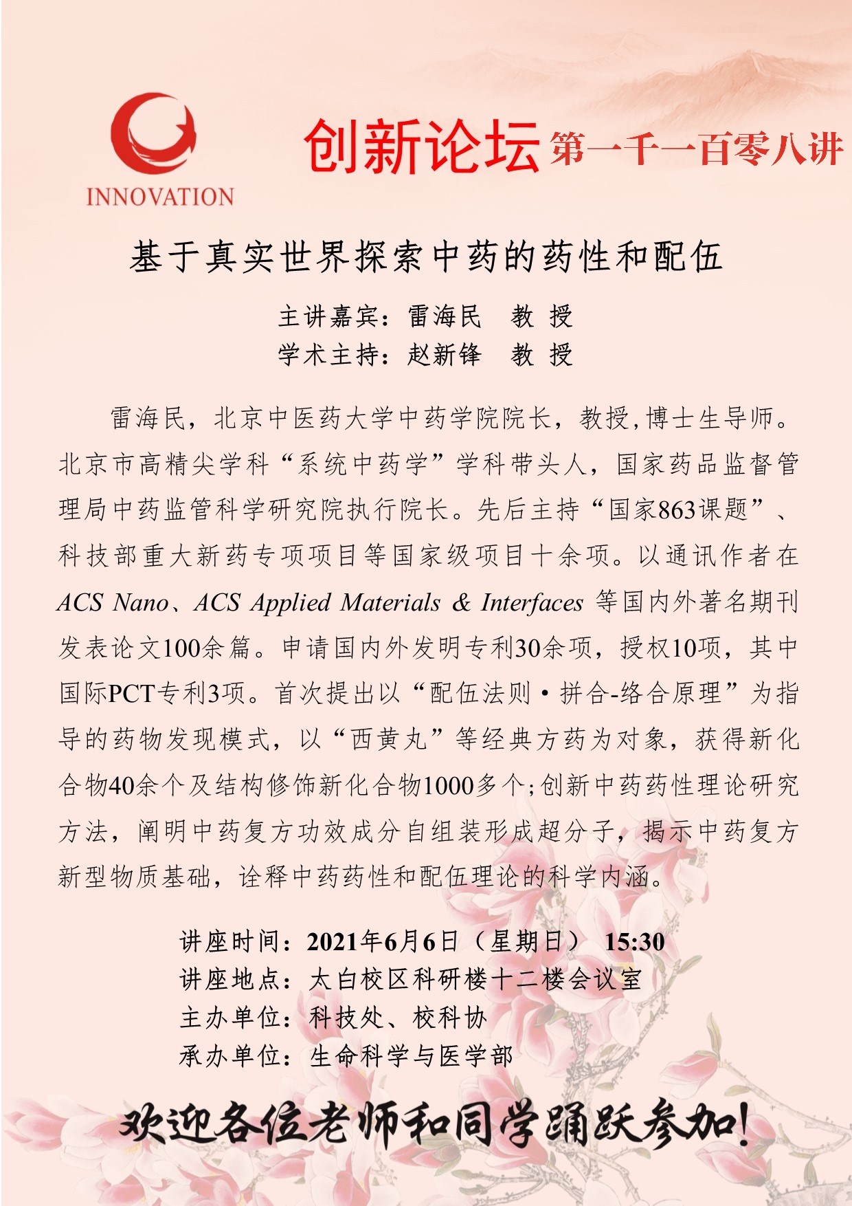 雷海民 教 授 bat365正版唯一官网创新论坛第一千一百零八讲:基于真实世界探索中药的药性和配伍 讲座时间 2021年6月6日(星期日) 15:30 讲座地点 太白校区科研楼十二楼会议室 讲座人介绍 雷海民 教 授 讲座内容